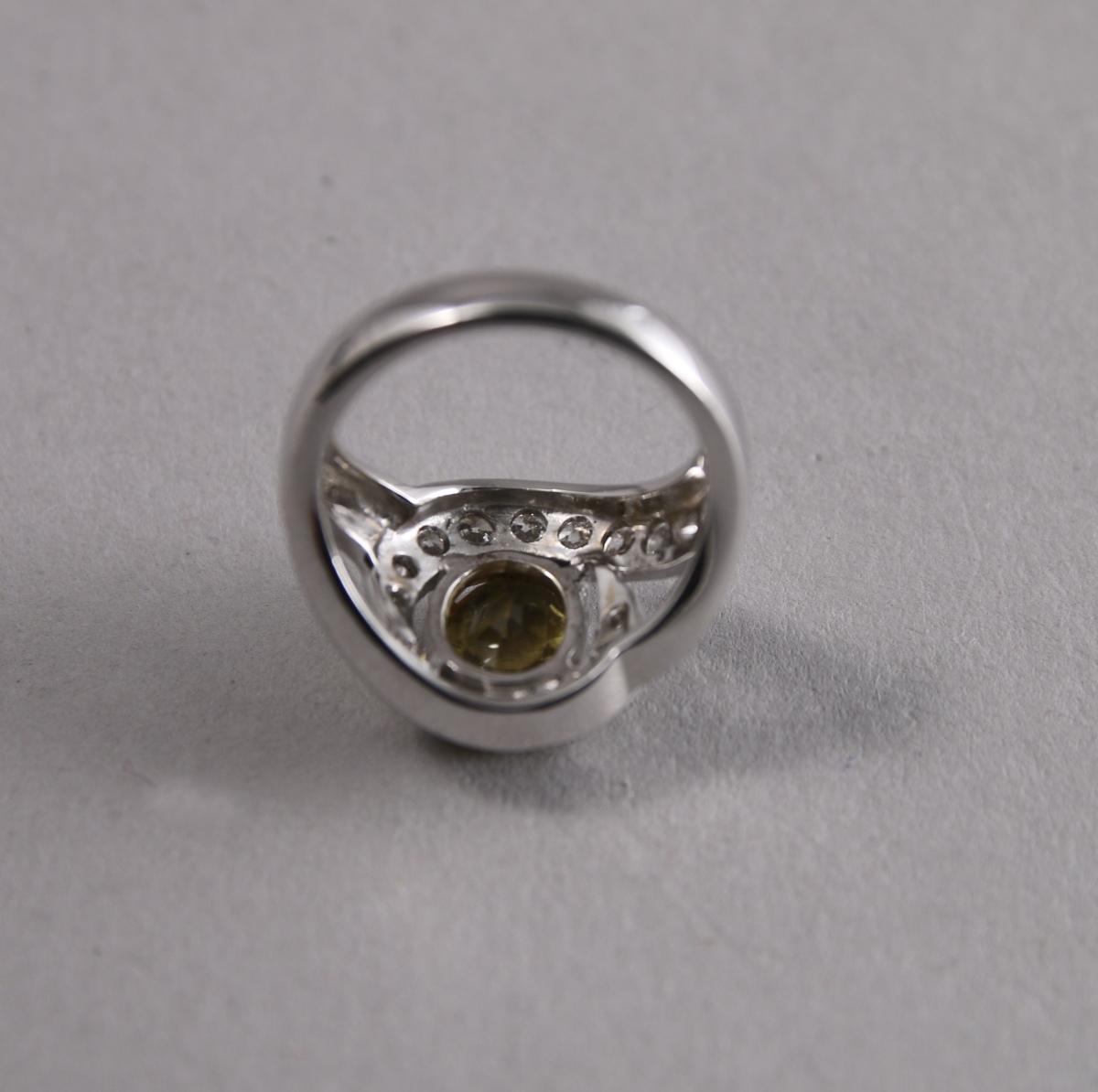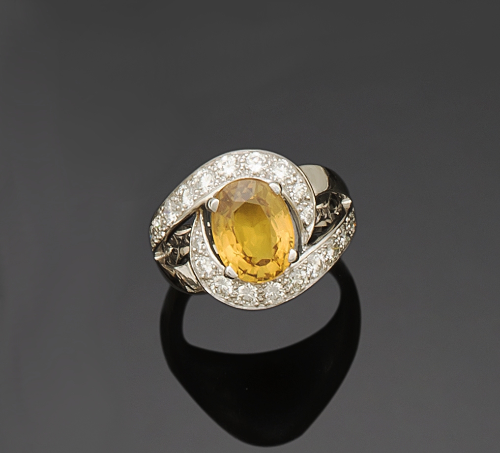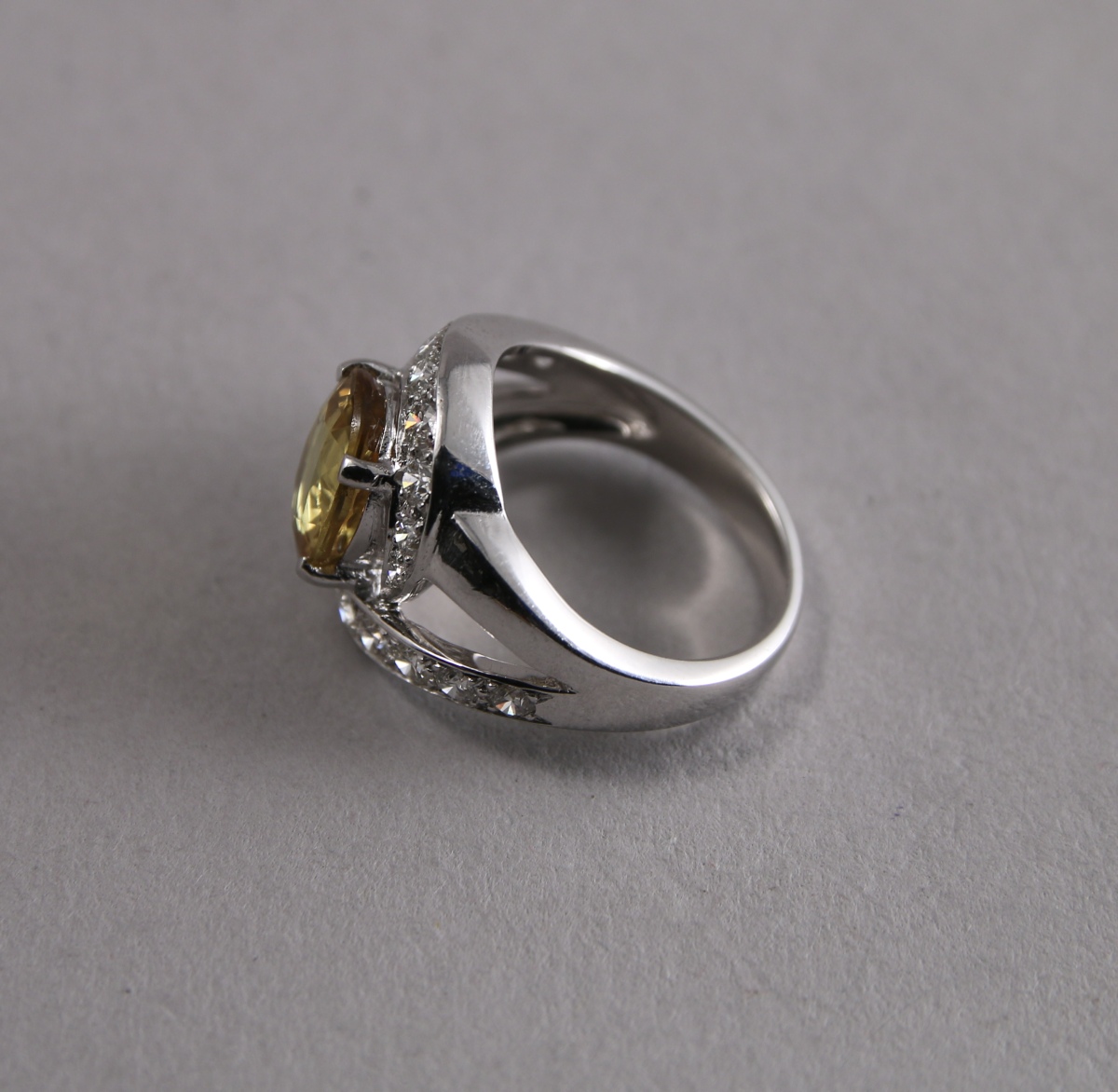 BAGUE TOURBILLON en or blanc, ornée au centre d'un SAPHIR jaune traité, taille ovale d'environ 3,45 carats, agrémenté de 20 DIAMANTS blancs taille moderne d'environ 1 carat.
