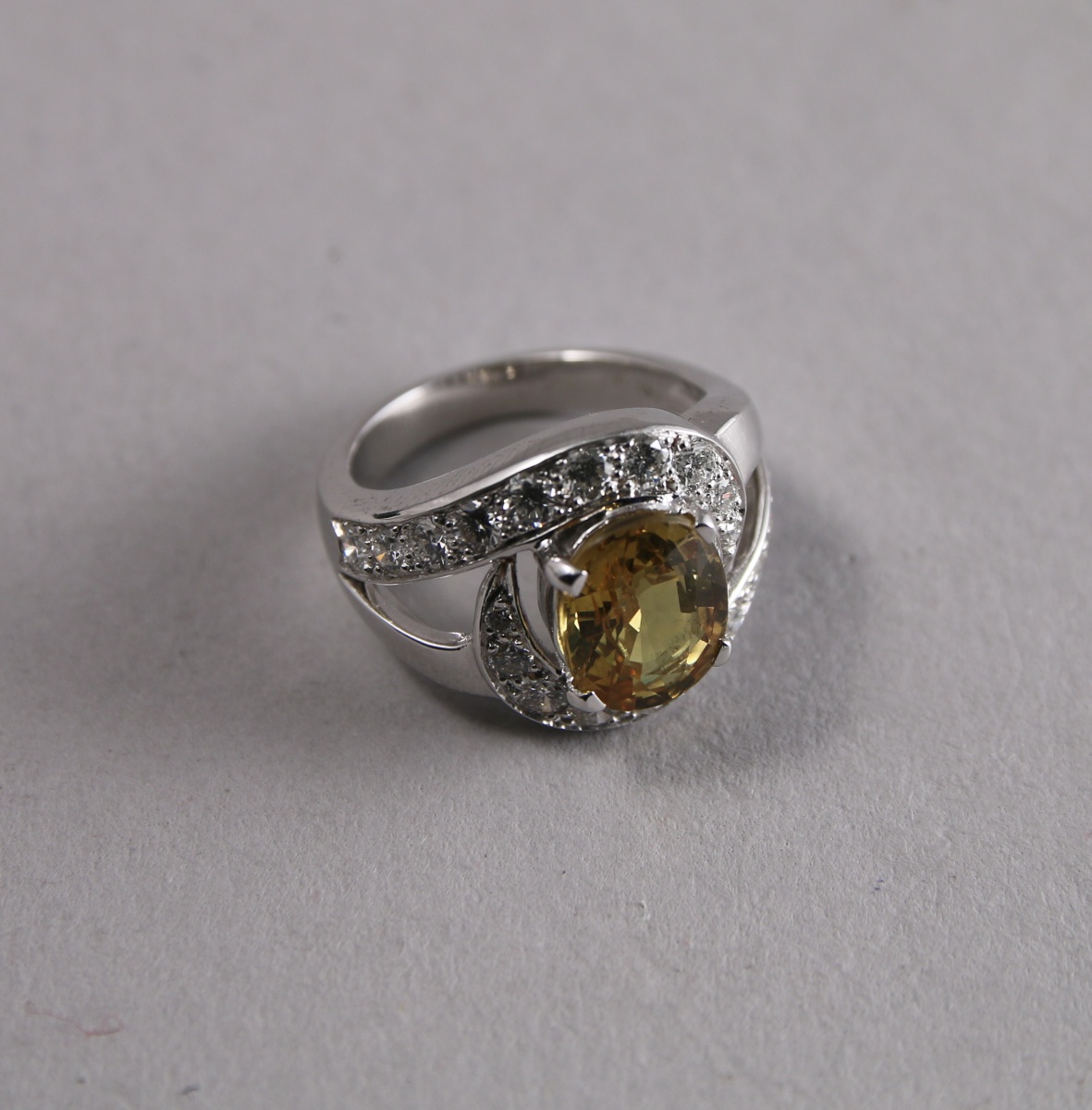 A white gold SWIRL RING set with an almond-shaped yellow SAPPHIRE and modern-cut DIAMONDS.