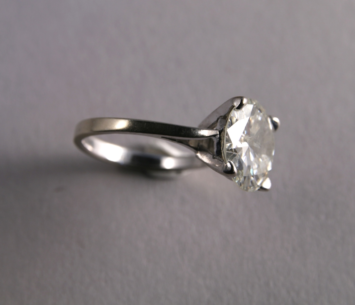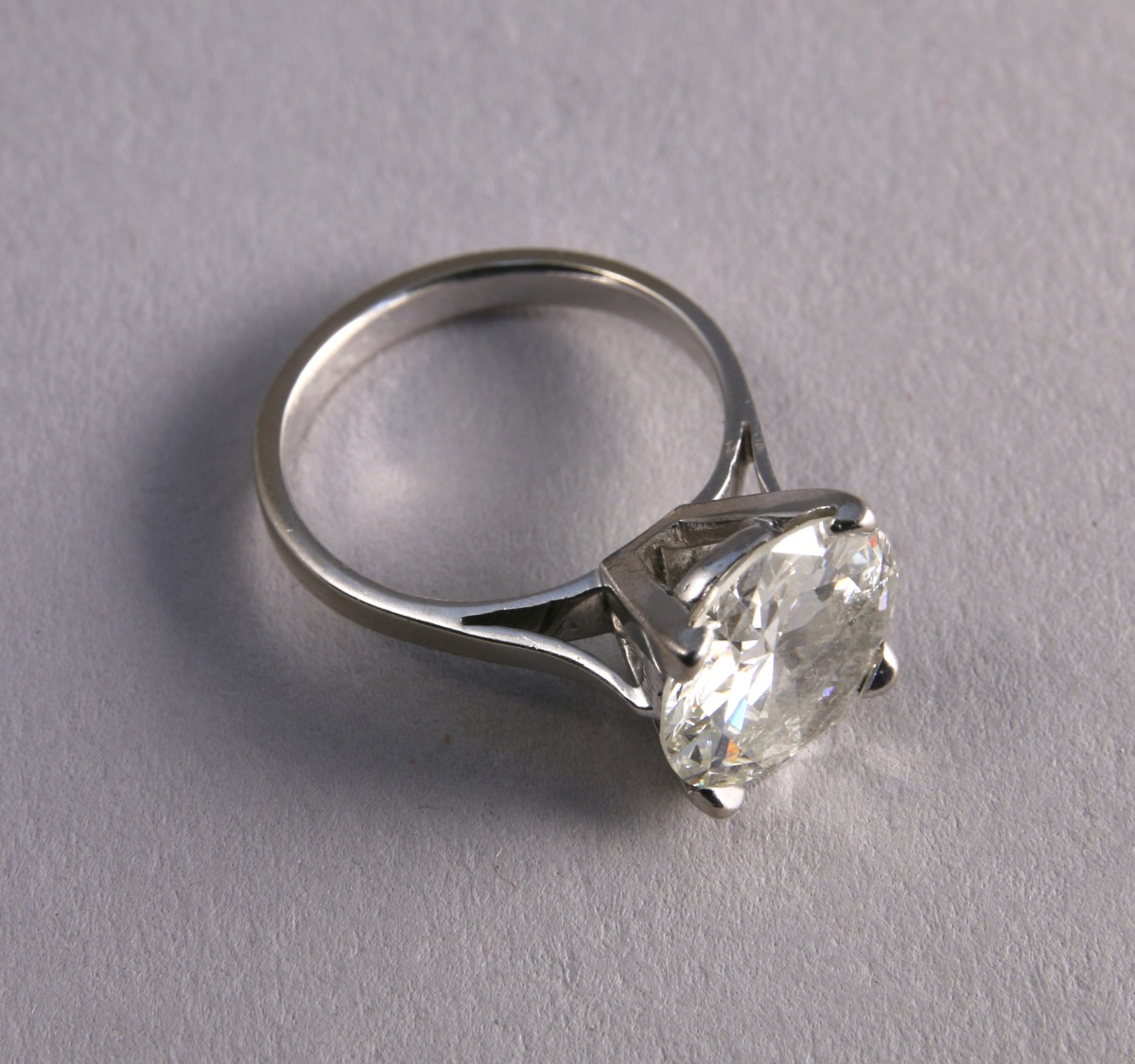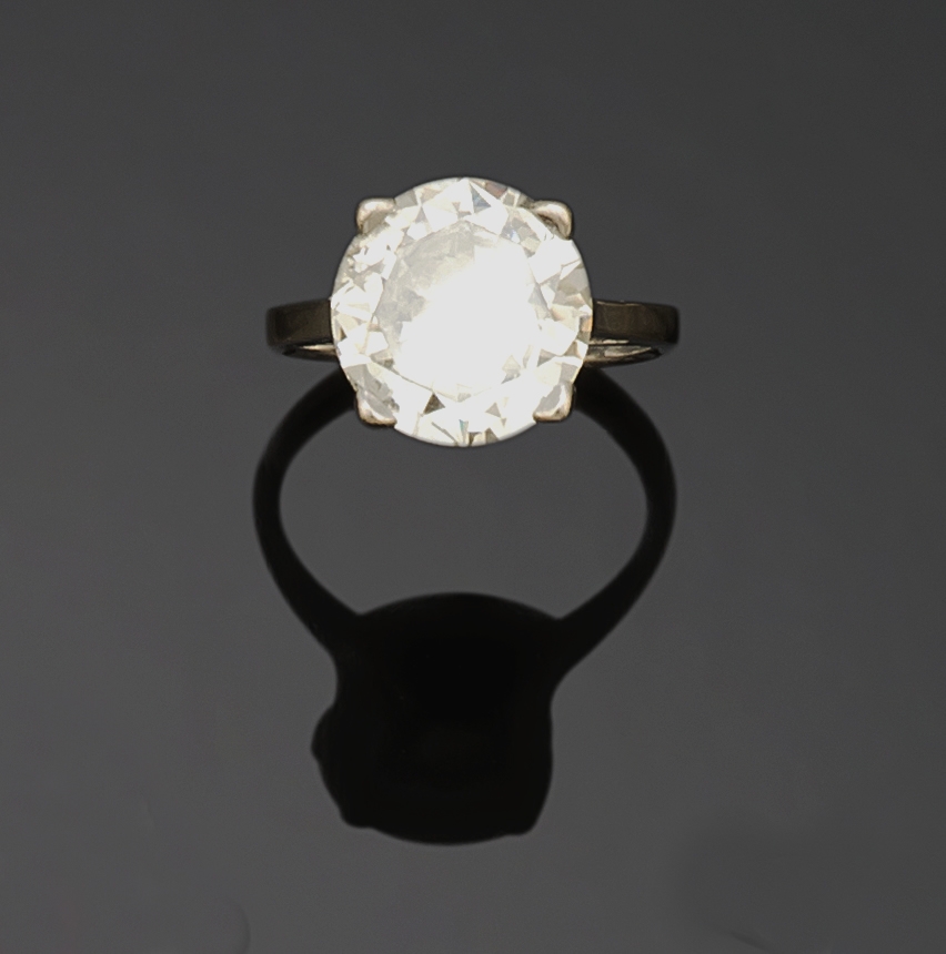 BAGUE en or gris 750 millièmes, ornée au centre d'un DIAMANT rond de taille brillant d'environ 4 carats entre quatre griffes.