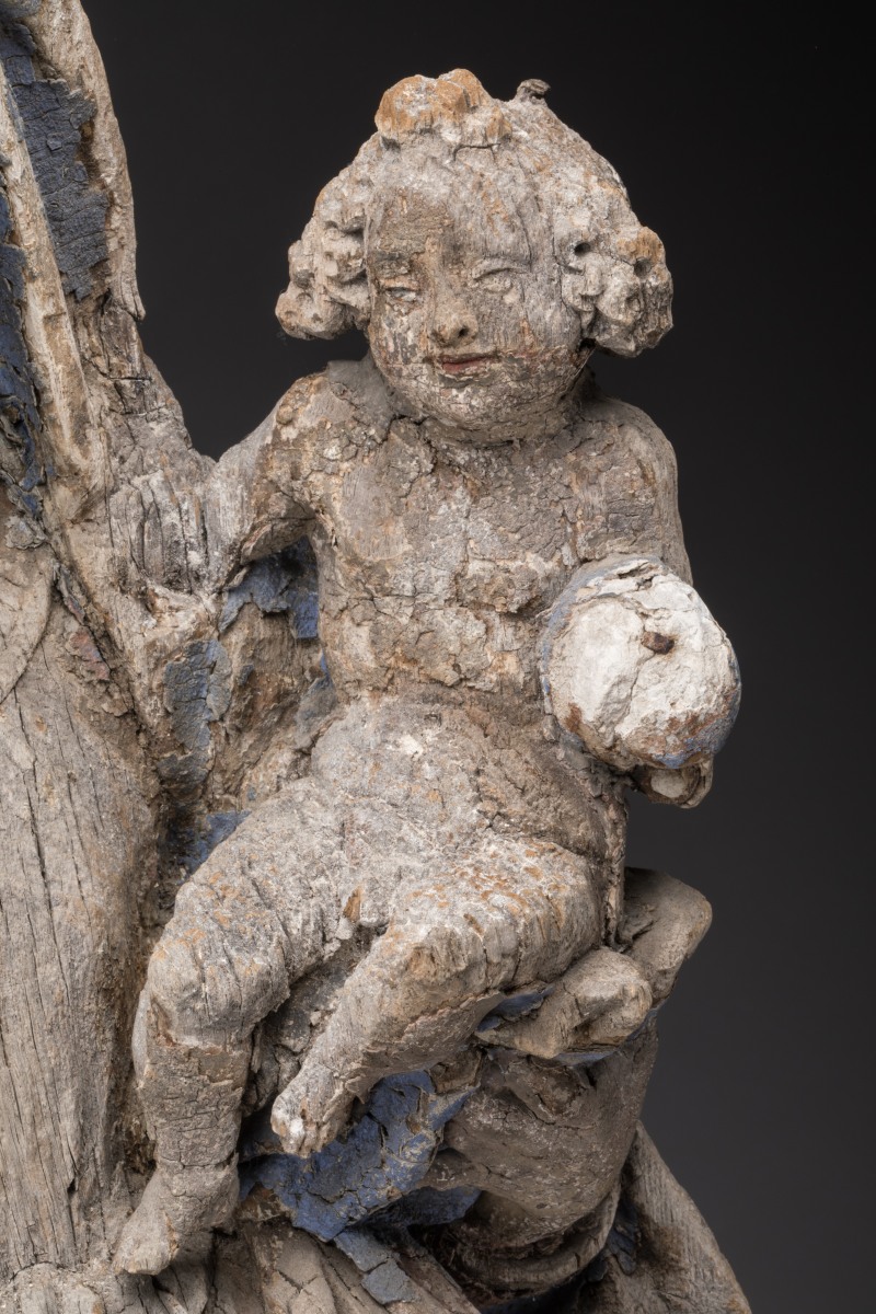 Bien que cette Vierge à l'Enfant soit désormais très fragmentaire, sa grande qualité d'exécution est visible sur une photographie ancienne datant des années 1900 (base Photo du ministère de la Culture et de la Communication: cliché numéro MH0033624). Son séjour en extérieur, en tant que décor du trumeau du portail de l'église de Breuil-Benoît, en contrebas du vitrail contemporain en l'honneur de Jeanne d'Arc exécuté à la fin du XIXème siècle par un maître-verrier d'Évreux, est certainement en grande partie responsable de ce niveau de dégradation. Cet emplacement privilégié témoigne cependant de l'importance qu'a pu représenter cette uvre dans la collection du Comte de Reiset. Ce dernier a su sans doute y reconnaître une uvre d'un des plus fameux exécutants baroques normands, Michel Lourdel: il est en effet encore possible de discerner la pose théâtrale de la Vierge, prononcée par une attitude en contrapposto appuyé et des drapés véhéments, notamment le retour virevoltant du manteau sur son bras droit, comme il est aussi visible sur la Vierge à l'enfant du retable de Bacqueville, l'un des fleurons bien connu du sculpteur rouennais. La Mère du Christ présente un certain nombre de détails vestimentaires que l'on rencontre chez ce maître: larges bordures du voile surmonté d'une haute couronne, robe ceinte par une ceinture haute ornée d'un nud central à deux boucles, coiffure de boucles entourant le visage. Elle porte haut un petit Jésus bien agité au visage particulier: ovale et fin, doté d'une expression charmante et mutine. Ces cheveux sont répartis en trois masses dont une houppette frisée centrale, véritable signature de l'artiste qui coiffe ainsi la plupart de ses anges et enfants Jésus.