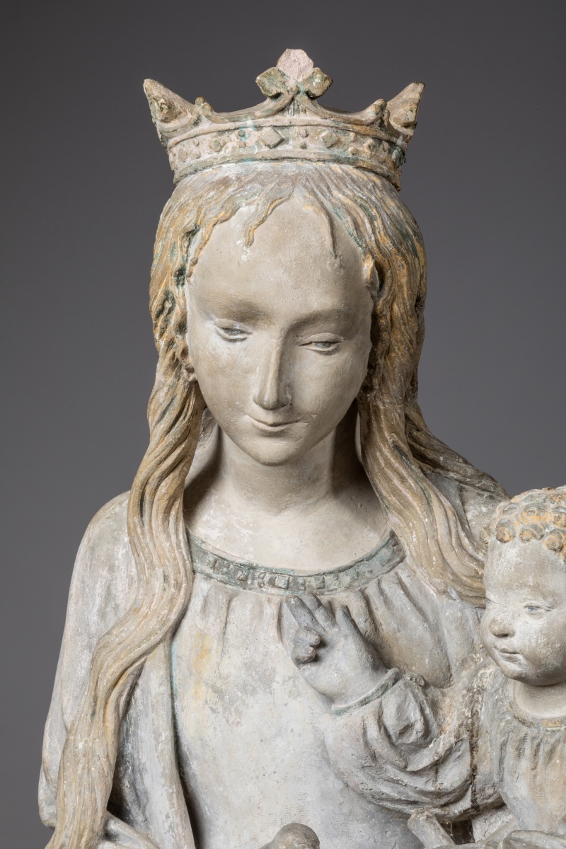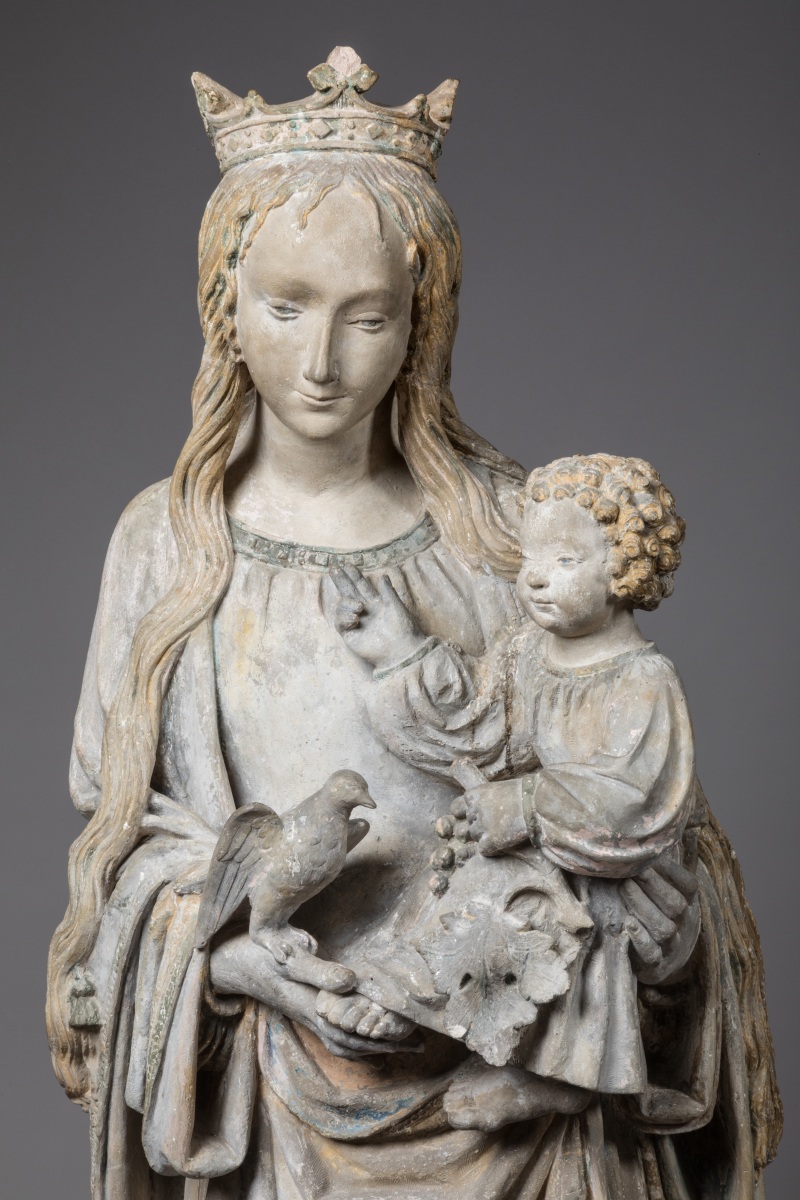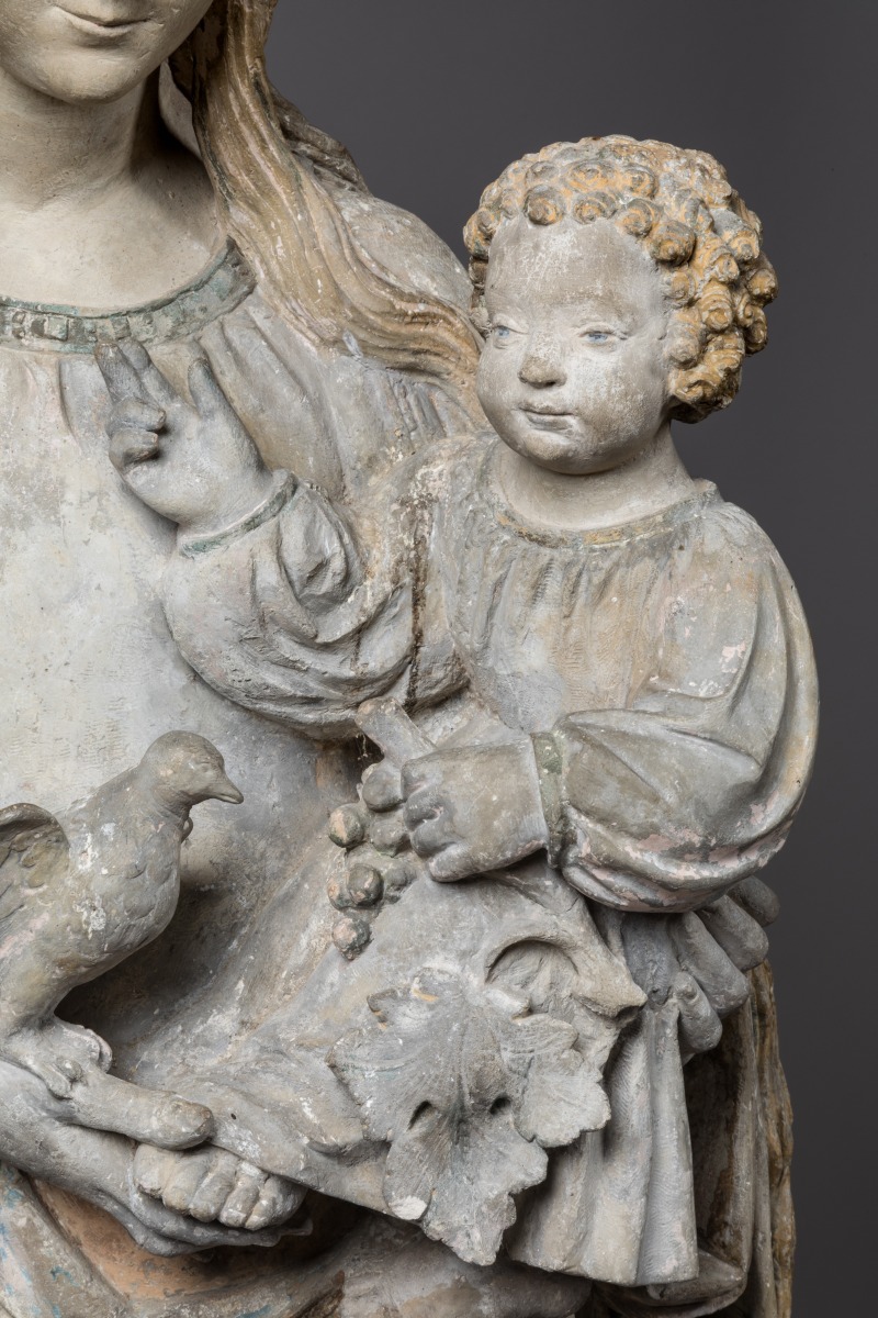 Debout sur un croissant de lune, la Vierge couronnée porte l'Enfant Jésus bénissant de sa main droite tout en tenant un cep de vigne dans la main gauche. Sa mère lui tient délicatement le pied gauche de sa main droite, sur laquelle est posé un oiseau. Dotée de ces caractéristiques si spécifiques - allongement significatif des jambes, visage ovale régulier au haut front bombé et yeux en amande encadré d'une chevelure longue et dénattée tombant en longues mèches torsadées sur les épaules, le petit Jésus remuant, vêtu d'une longue tunique et coiffé de mèches bouclées - cette charmante composition appartient au répertoire traditionnel champenois du premier tiers du XVIème siècle. Dès les époques antérieures, comme en témoignent les groupes de Villeloup (XIVème siècle) ou de saint André des Vergers (fin du XIVème siècle), les représentations mariales portant les attributs du raisin et d'un oiseau ont été fréquentes. Cette référence dogmatique à la célébration de l'Eucharistie est cependant ici accompagnée d'un thème beaucoup plus rare pour l'époque et la région, celui de l'Immaculée Conception, par la présence du Croissant de lune. Inspirée du livre de l'Apocalypse (ch. 12, v. 1), cette iconographie si originale reprend celle de l'un des joyaux de la sculpture champenoise du XVIème siècle: La Vierge dite "aux raisins" de l'église Saint-Urbain de Troyes.
