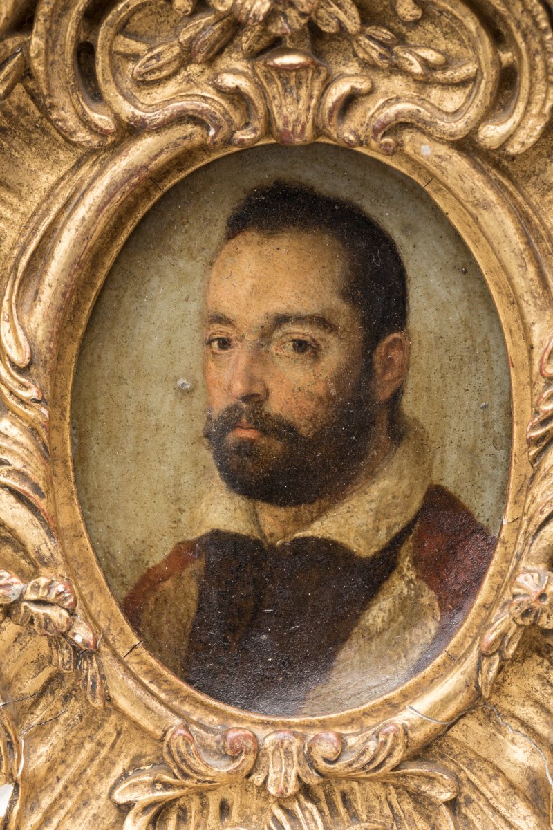 Dans un riche cadre en bois sculpté et doré de style Rocaille.
