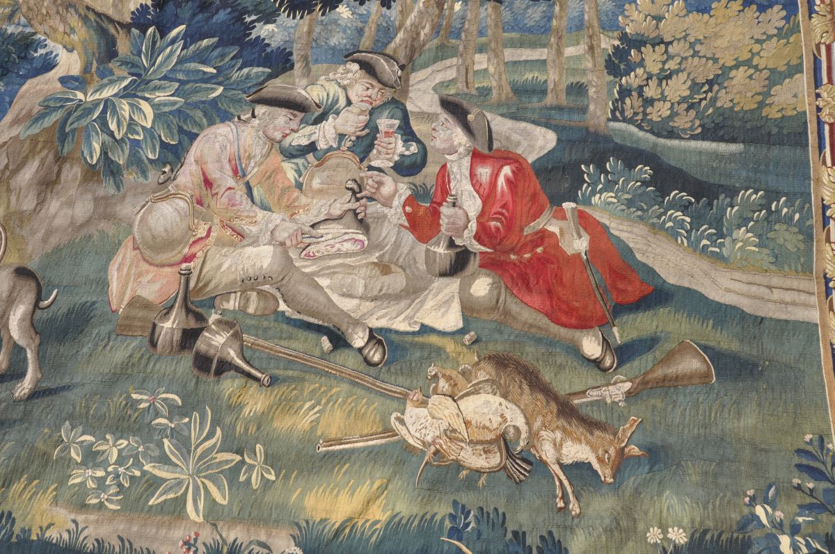 Cette grande, pittoresque et fine tapisserie est à décor d'une clairière. À droite de la composition, un groupe de trois chasseurs, dont l'un porte un vêtement rouge vif, partagent une collation, après une chasse au lièvre. On aperçoit à côté d'eux des fusils et un lièvre, ce qui livre un tableau de chasse assez restreint... Mais la journée n'est pas finie. À leur gauche, trois chiens semblent également se restaurer tandis qu'un quatrième attrape dans sa gueule un gibier et qu'un autre lièvre décampe vers la gauche de la composition.