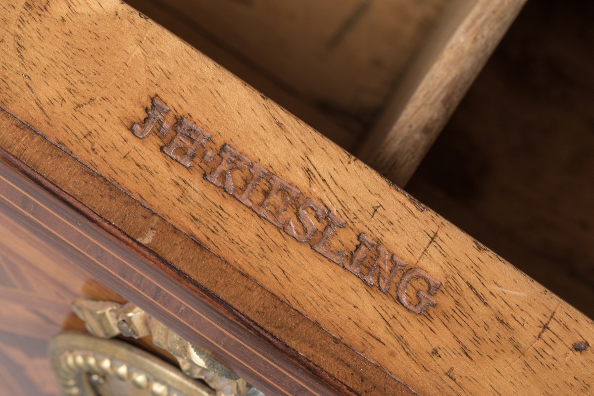Né à Duledlot (Düsseldorf?) en Allemagne, fils de Sébastien Kiesling, maître épicier; Jean Henri (ou Armand; Herman) Kiesling se marie en 1778 en l'église abbatiale d'Ainay. Ébéniste lyonnais, il travaille place Saint-Michel en 1779, puis en 1790 rue de l'Arsenal. On ne connaît aujourd'hui que trois meubles portant son estampille, deux tables tric-trac et notre bureau cylindre. Les auteurs s'accordent à dire que ce meuble est "à la fois parfaitement dans l'esprit de la production alsacienne par le contraste des jeux de bois et cependant orné des armoiries d'une famille de la région lyonnaise".