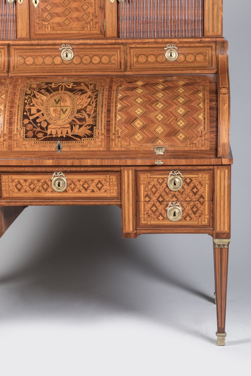 La production des bureaux à cylindre apparut dans les années 1760-1765 avec les créations des OEBEN, GARNIER ou BOUDIN. Notre rare meuble présente des analogies avec les bureaux à cylindre de François-Gaspard Teuné (reçu maître en 1766): caractère monumental, placage de bois marqueté en feuilles, pieds gaines avec des triglyphes en bronze doré, marqueterie aux armes, trophées...