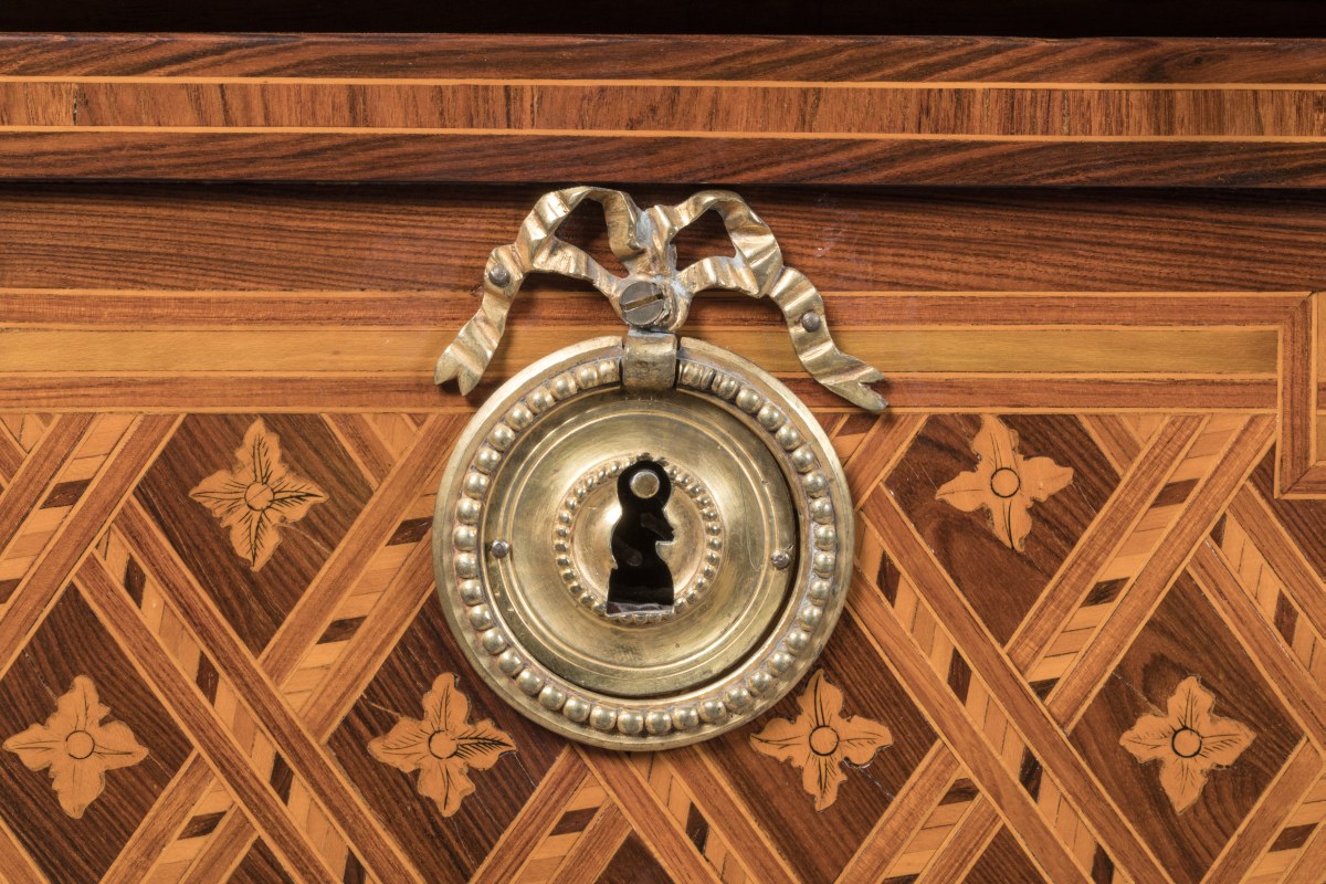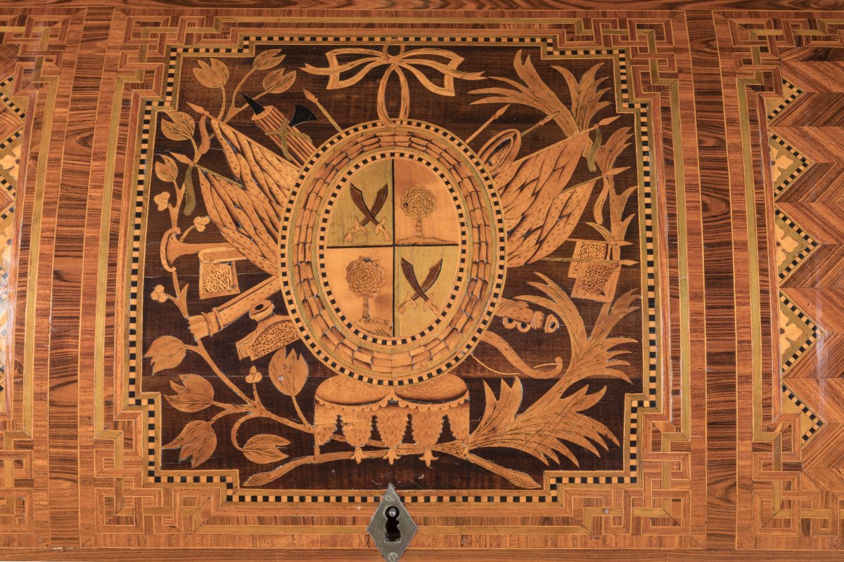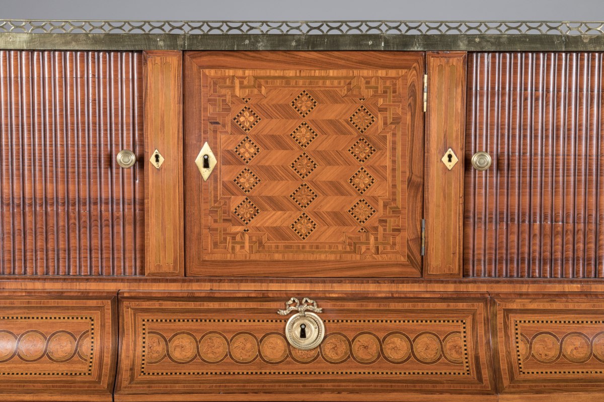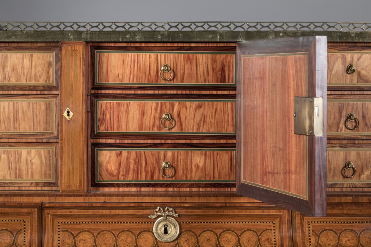 Décor toutes faces de marqueterie, alternant essences claires, sombres et teintées en vert: filets de grecques, frisage en point de Hongrie, motifs de quatre feuilles, losanges.