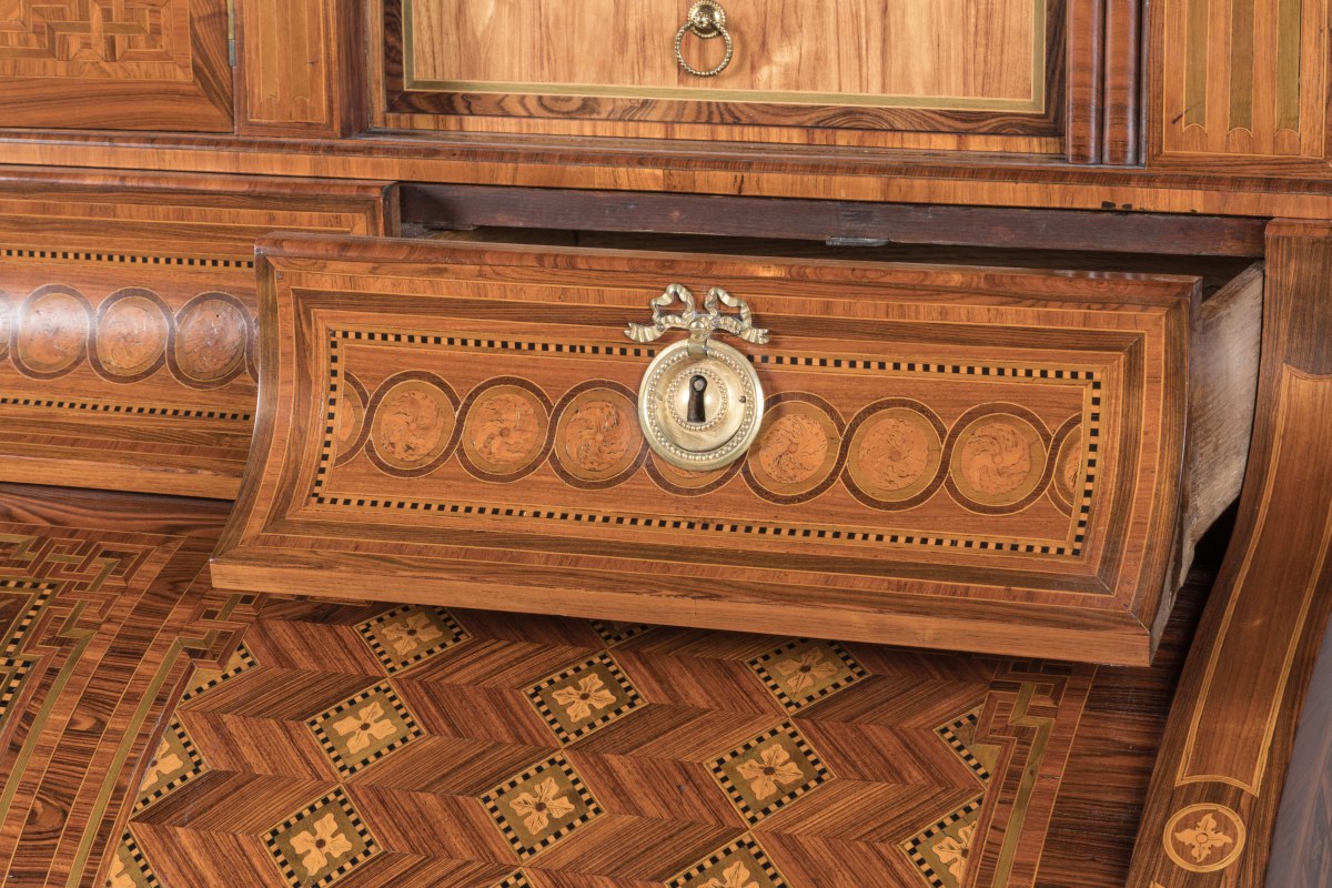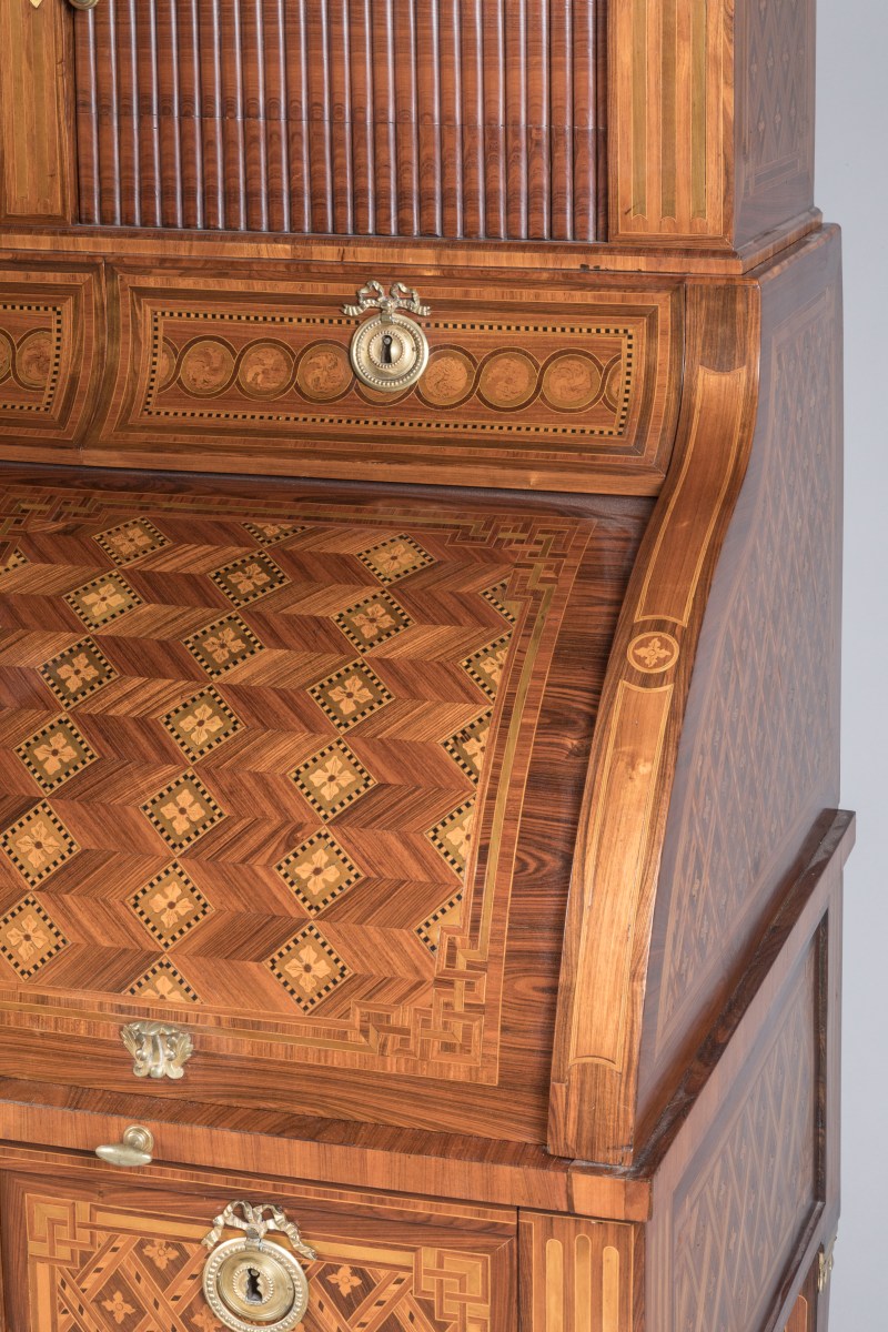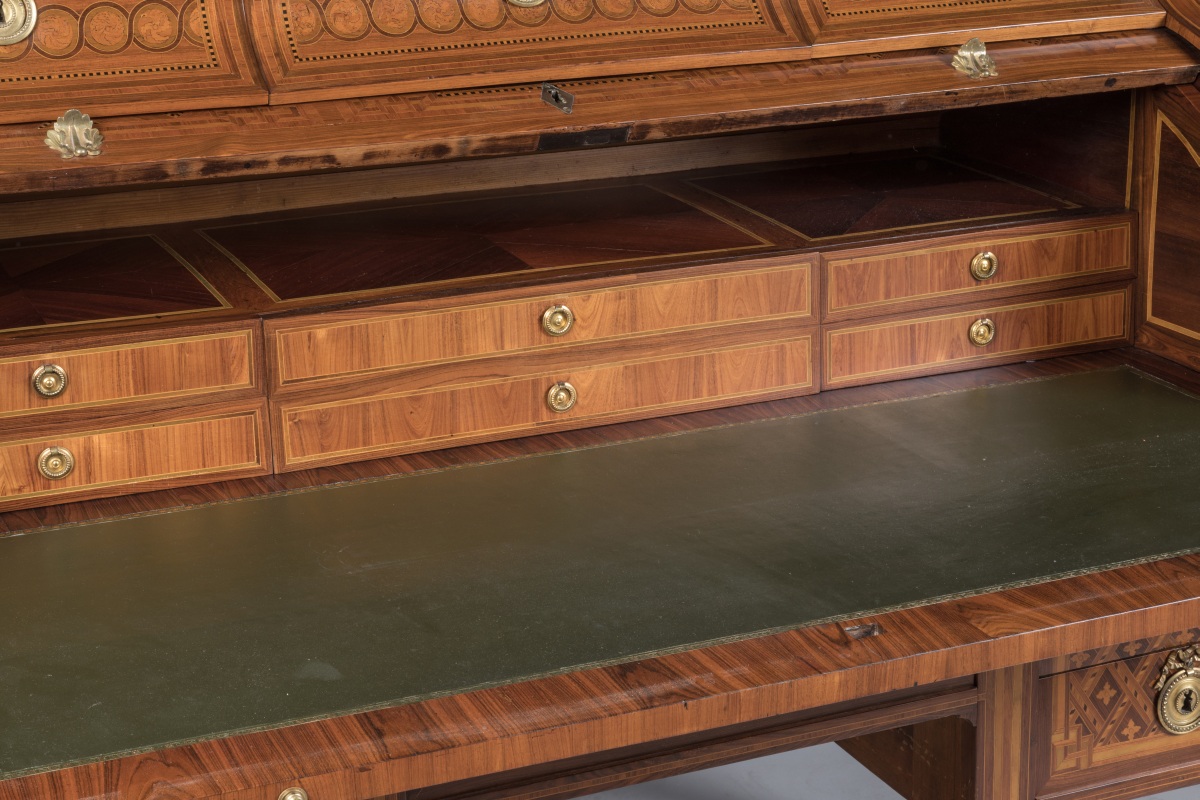 en bois de placage toutes faces: bois de rose et de violette, sycomore, amarante, buis, bois teinté vert. Le gradin supérieur ouvre à neuf petits tiroirs dissimulés par un abattant encadré de deux rideaux coulissants. Il présente trois tiroirs galbés, un cylindre, rigide - découvrant tiroirs et casier - une tablette coulissante intermédiaire, deux caissons latéraux ouvrant à deux tiroirs - l'un formant coffre et tiroir central.