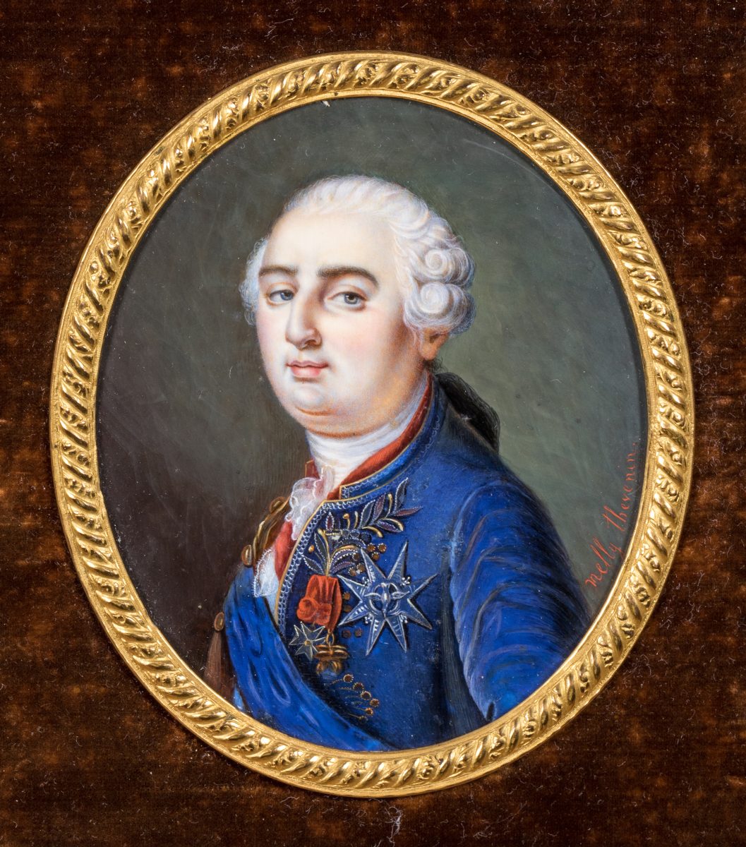 After Joseph BOZE. Louis XVI in blue coat embroidered with gold, bearing the order of Saint-Louis and the plate of the Saint-Esprit. Miniature signed "Nelly Thévenin".