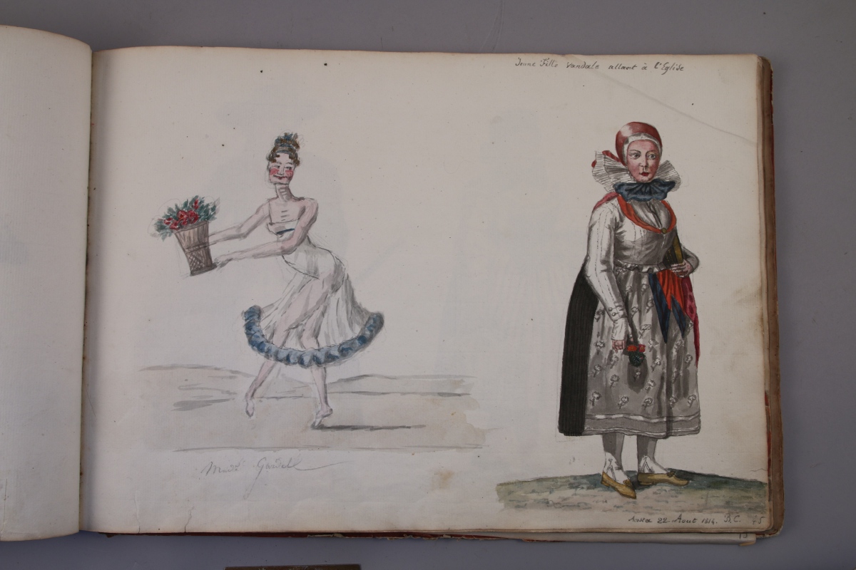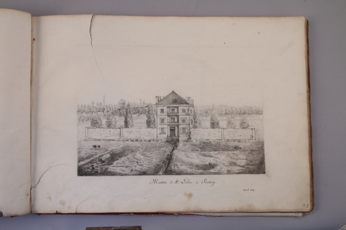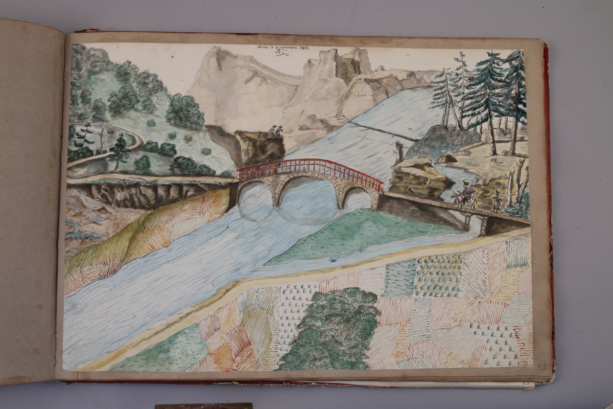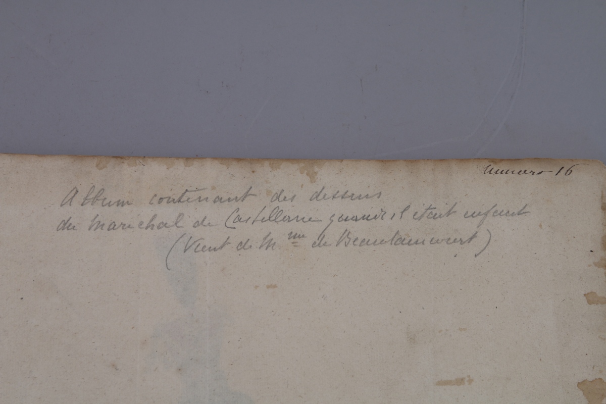 Ces dessins réunis sous forme d'un recueil relié et de manière non chronologique, ont été réalisés entre 1813 et 1820 en majorité par Boni de Castellane (excepté 4 dessins), lors de ses séjours dans les demeures familiales ou en garnison.
