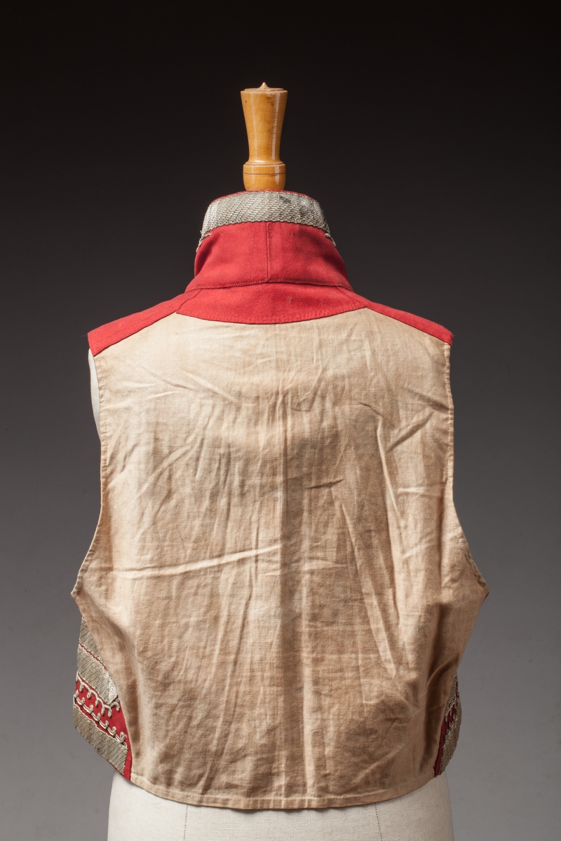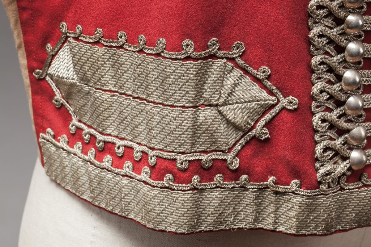 Drap écarlate, galons, tresses et bouton d'argent. Montage original avec doubles coutures des empiècements d'épaule.
