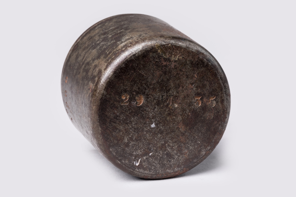 MATRICE de BOUTON de forme cylindrique en acier aux armes du Maréchal de Castellane (de gueules, à la tour donjonnée de trois pièces d'or, maçonnée de sable). Porte sa devise: Honos ab Armis: "L'honneur nous vient des armes".