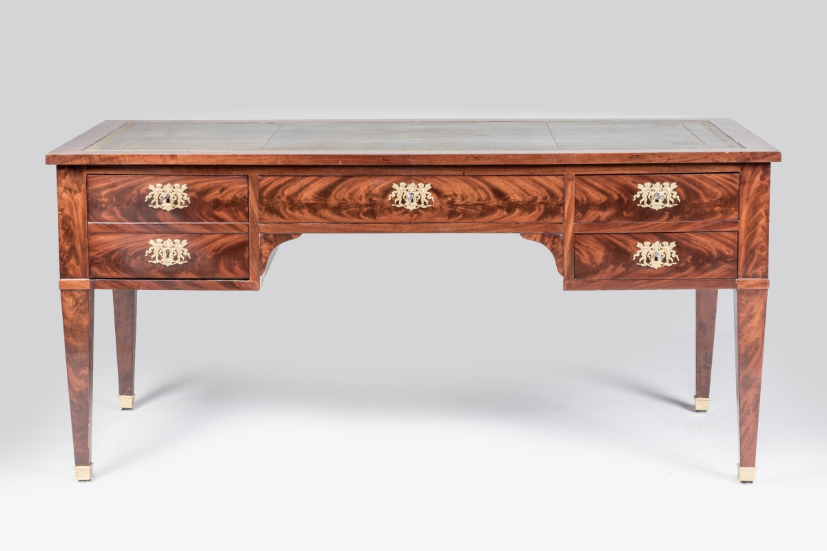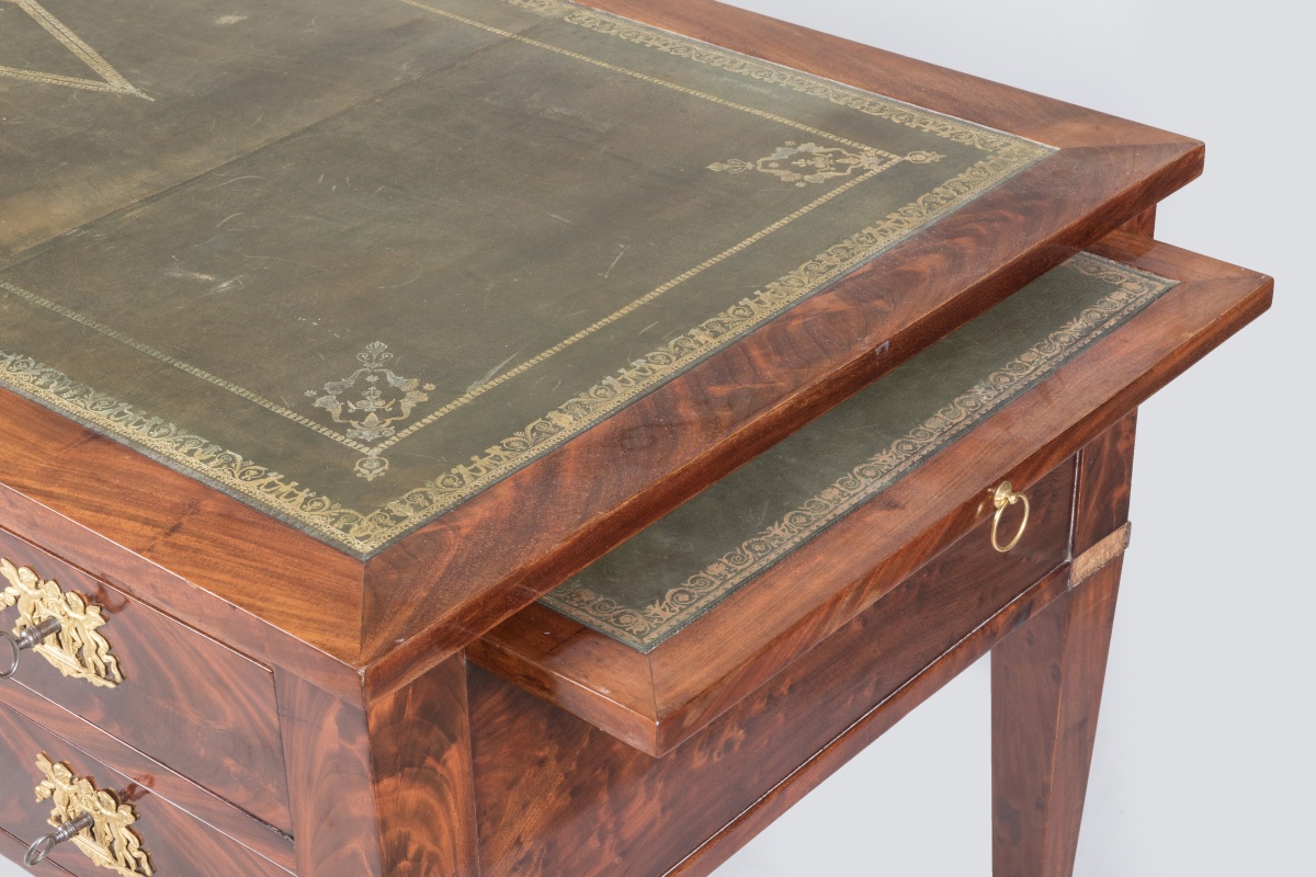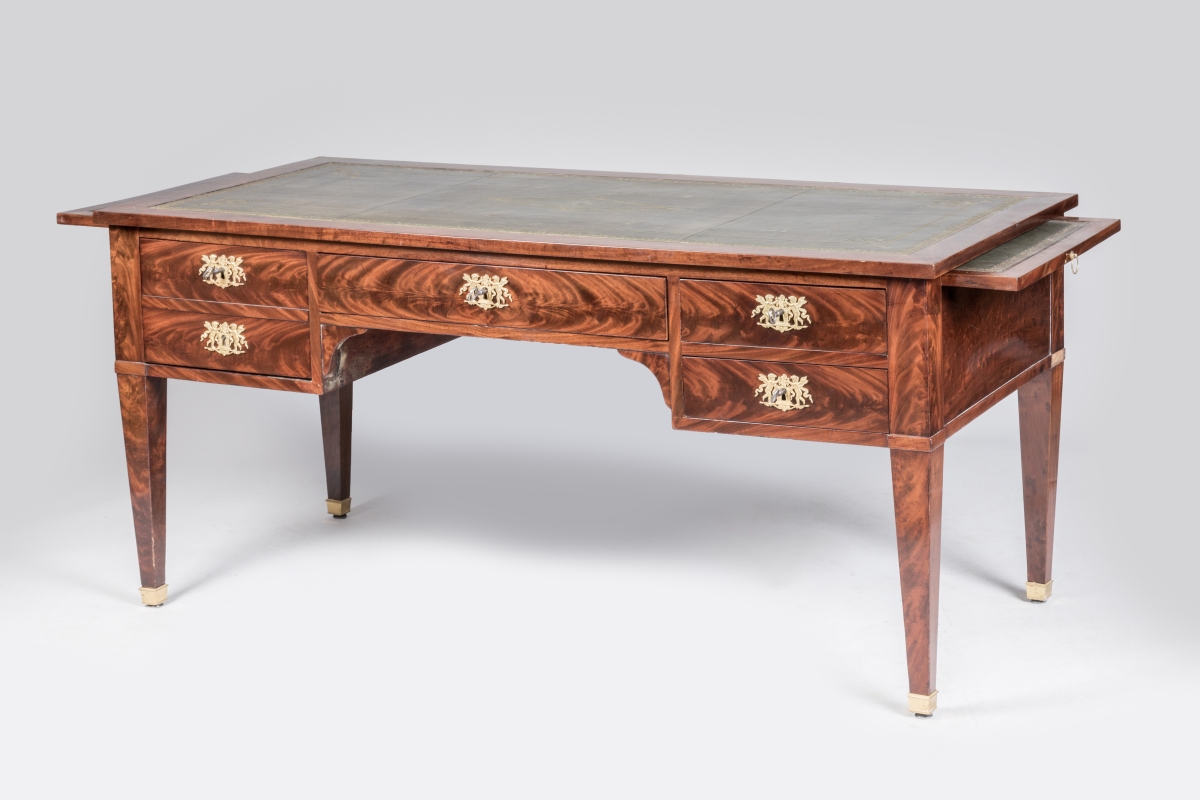 en acajou et placage d'acajou flammé ouvrant par quatre tiroirs, dont l'un découvre un coffre, et deux tirettes latérales. Cinq tiroirs simulés sur l'autre façade. Les entrées de serrure en bronze ciselé et doré figurant des amours entretenant le feu sacré avec des rameaux d'olivier. Le bureau repose sur quatre pieds gaine terminés par des sabots de bronze. Le plateau et les tirettes gainés de cuir vert à décor aux petits fers (rapportés).