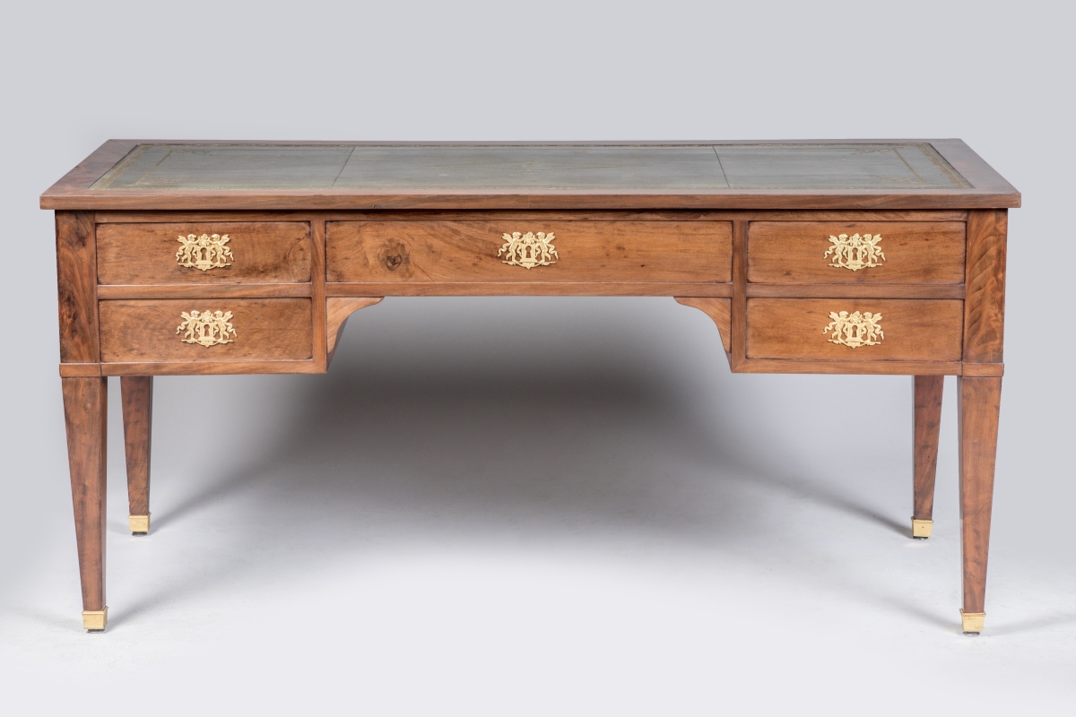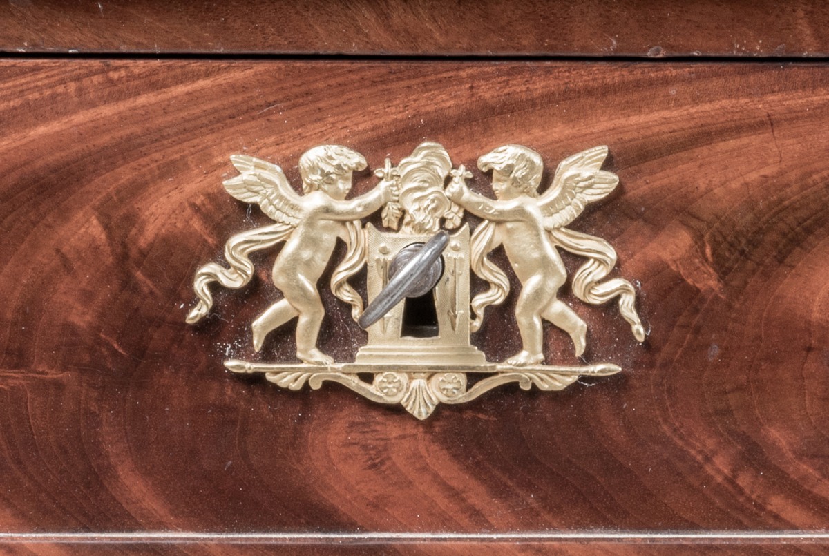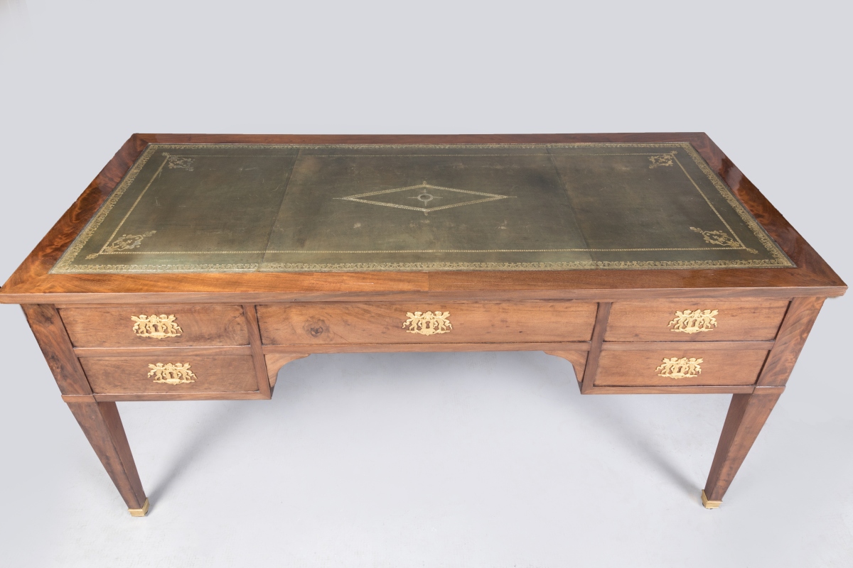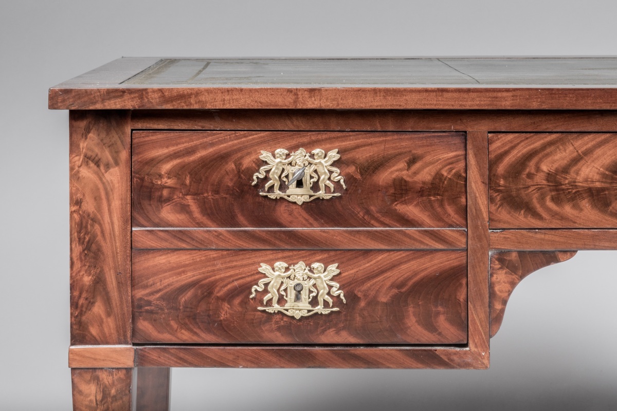 en acajou et placage d'acajou flammé ouvrant par quatre tiroirs, dont l'un découvre un coffre, et deux tirettes latérales. Cinq tiroirs simulés sur l'autre façade. Les entrées de serrure en bronze ciselé et doré figurant des amours entretenant le feu sacré avec des rameaux d'olivier. Le bureau repose sur quatre pieds gaine terminés par des sabots de bronze. Le plateau et les tirettes gainés de cuir vert à décor aux petits fers (rapportés).