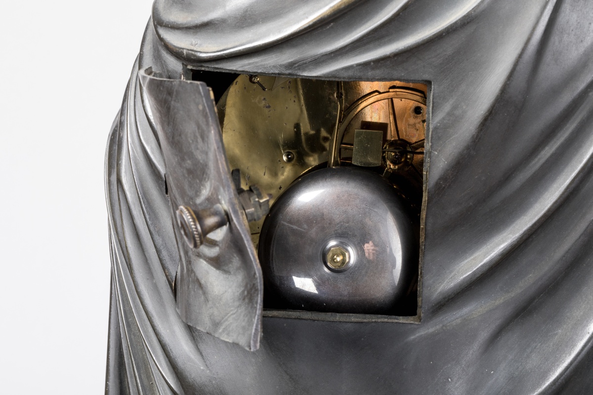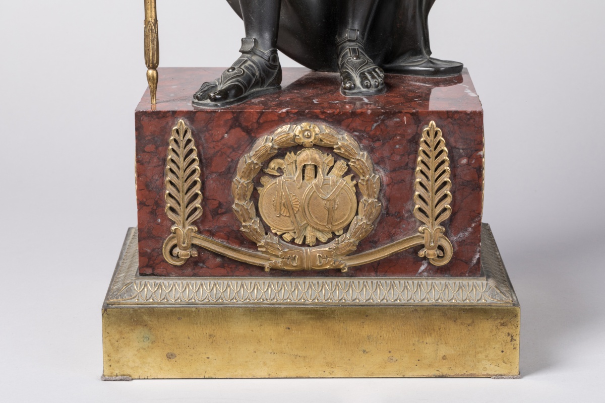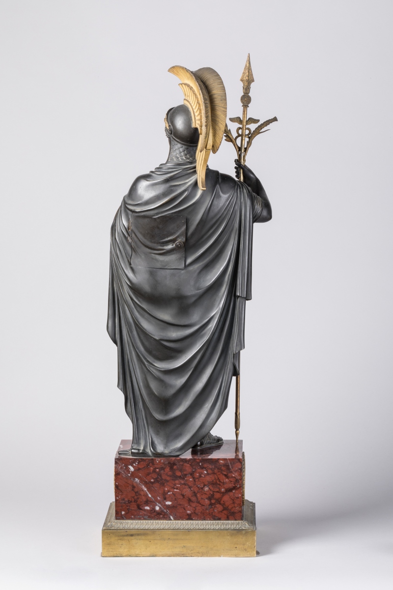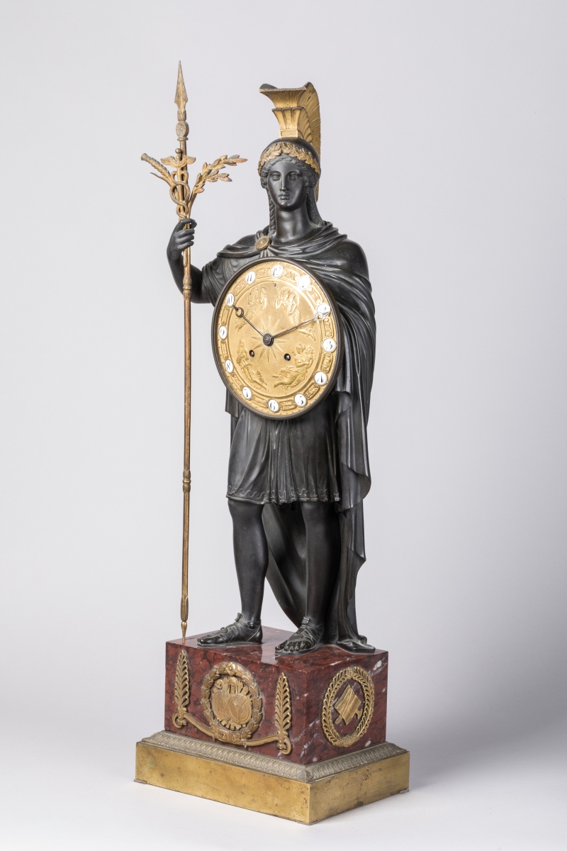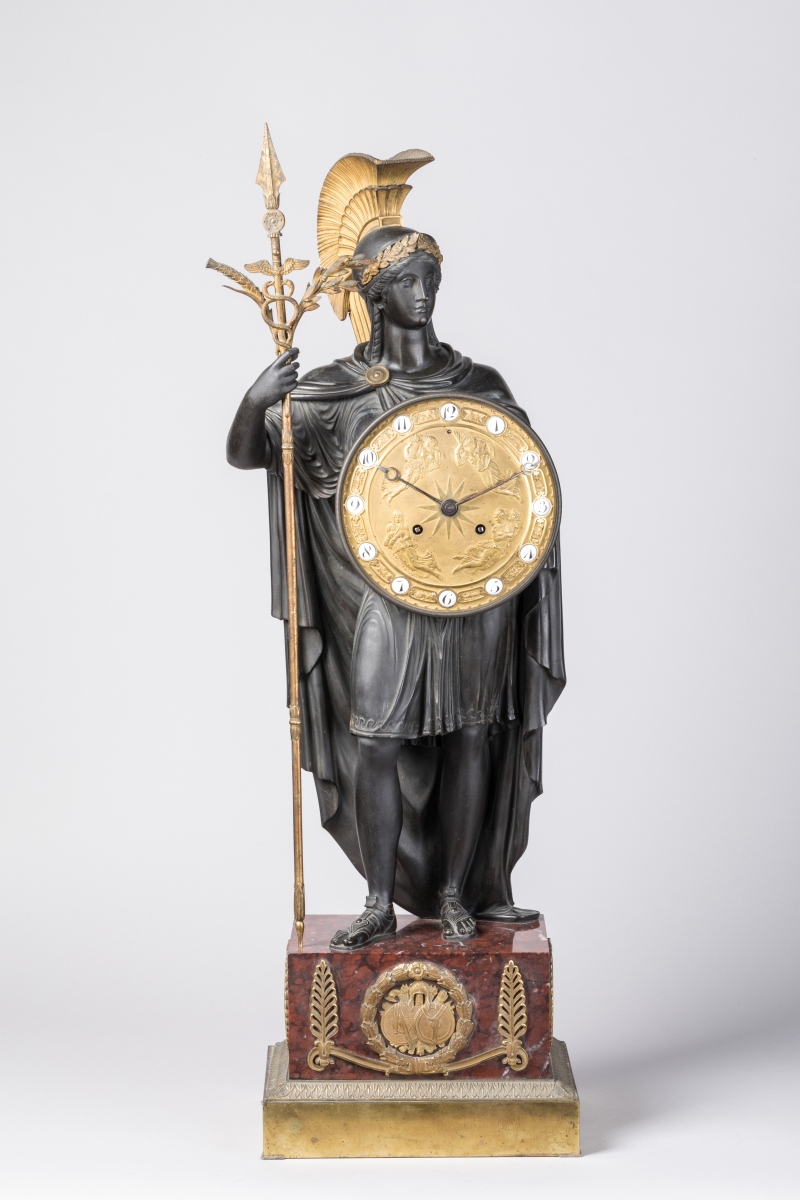 en bronze doré et patiné. La déesse debout, coiffée d'un casque à crête lauré, vêtue d'une courte tunique et d'un long manteau retenu par une agrafe. Armée d'une lance ornée d'un caducée, d'un rameau de laurier et d'un épi de blé. Elle porte un bouclier formant cadran, orné des quatre Saisons entourées de médaillons émaillés blancs indiquant les heures en chiffres arabes, alternés des