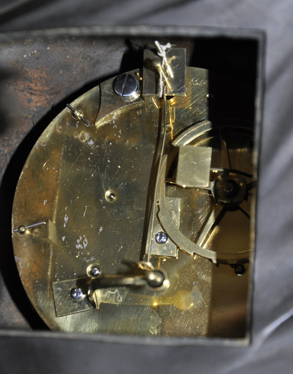 (un motif de bronze sur la base et le balancier manquants, petite perforation au niveau de la porte du mécanisme).