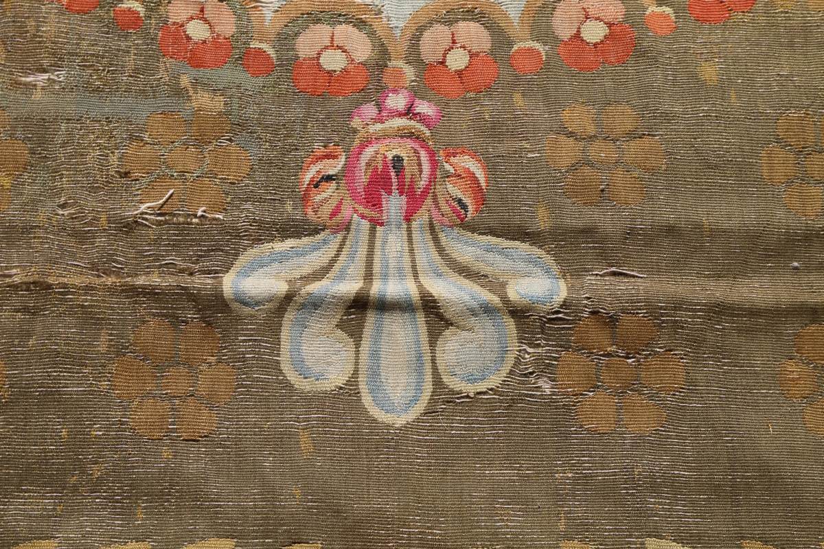 à décor polychrome sur fond vert à semis de fleurs d'une rosace centrale cerclée d'une frise de roses et flanquée de rinceaux et palmettes. Les angles sont ornés de bouquets floraux réunis par une frise de lauriers ponctuée de fleurons. Bordure à fond vieux rose ornée de rinceaux et fleurons.
