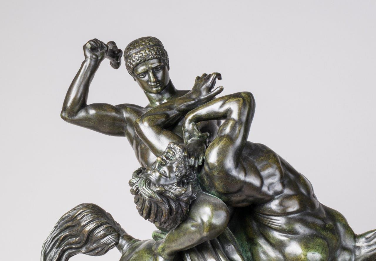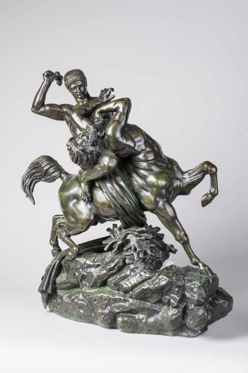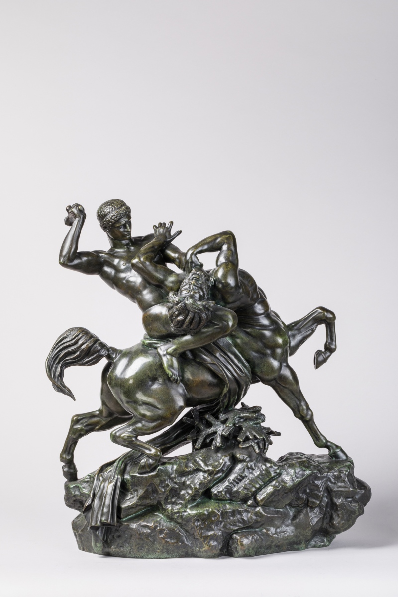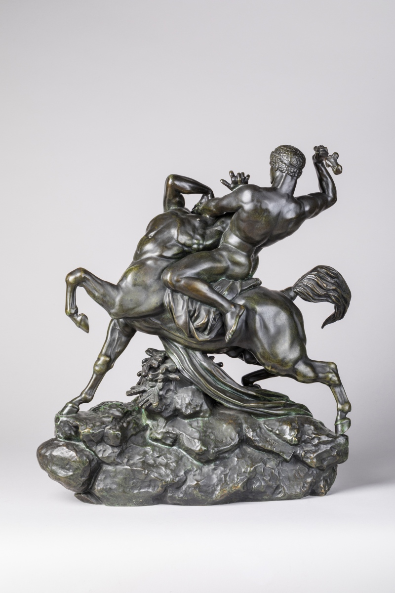 Antoine-Louis BARYE. Theseus slaying the Centaur Bienor. Bronze with green and black patina. Signed twice. Stamped with the Barbedienne foundry mark.