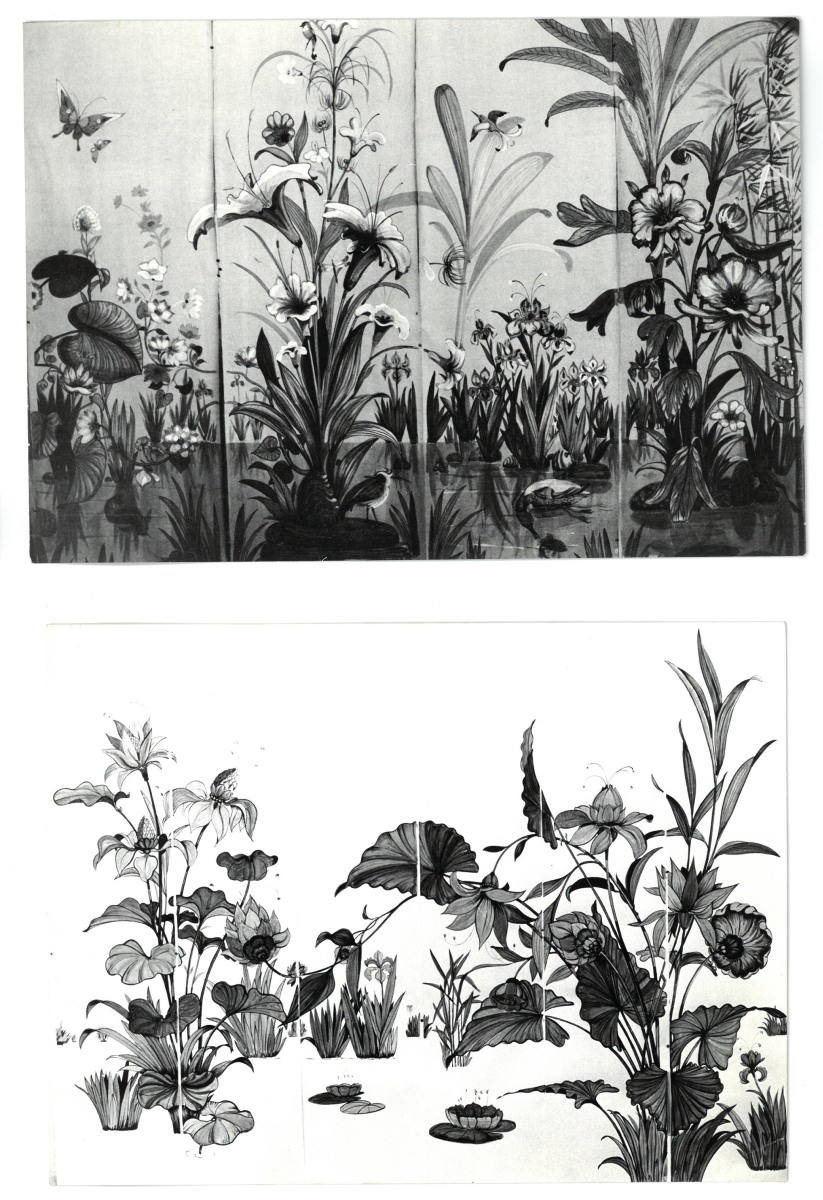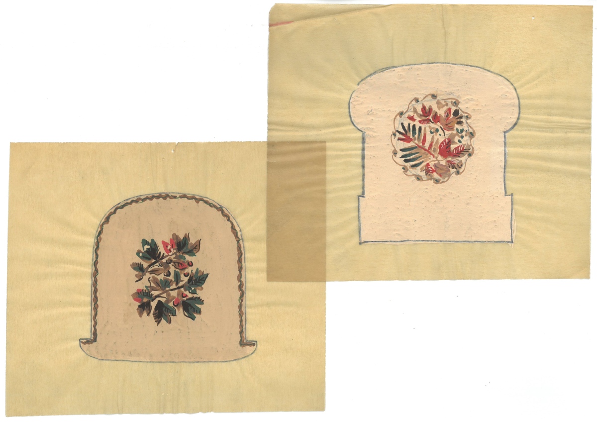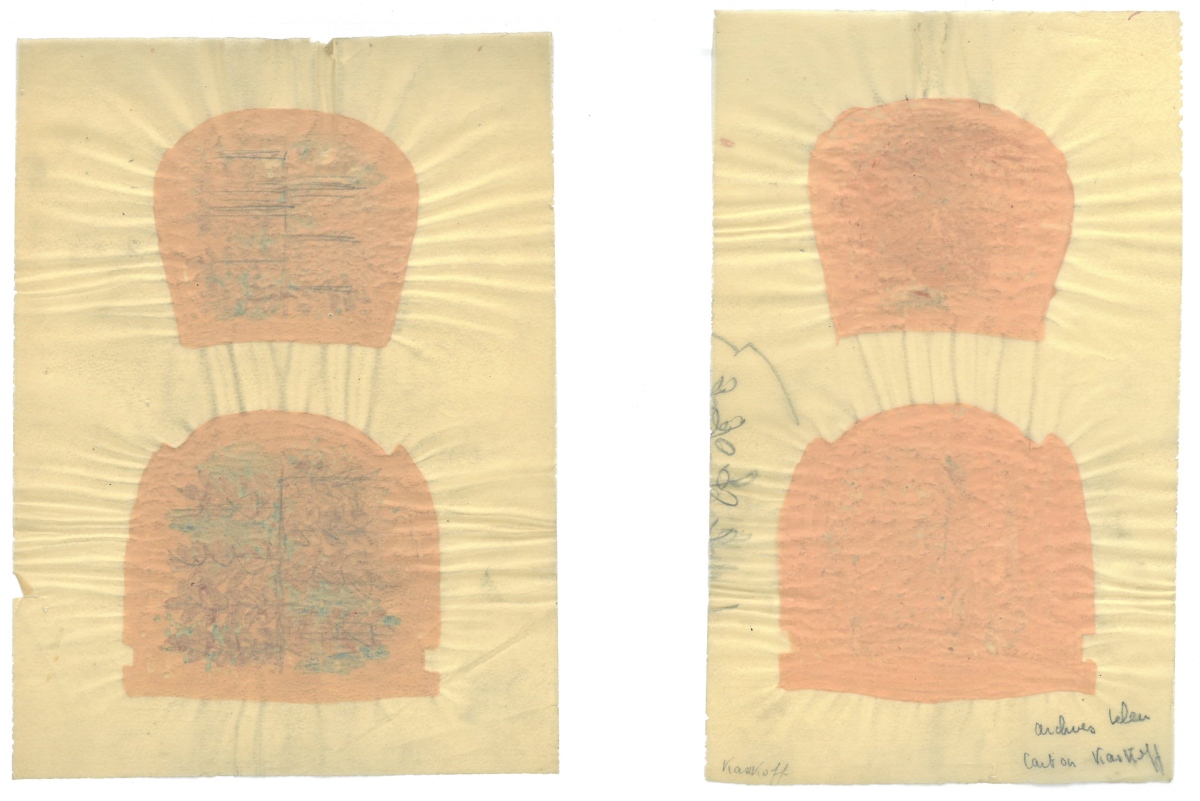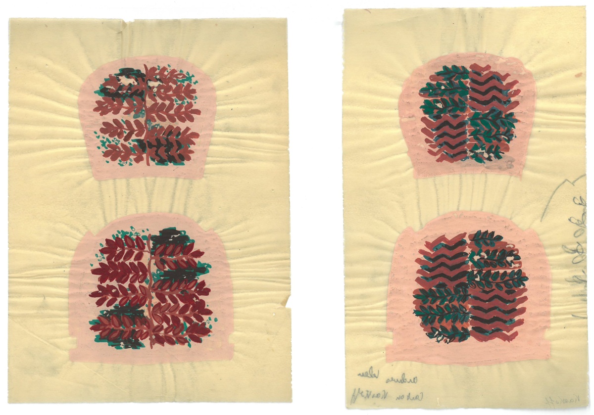 photos, projets de décoration, vues imprimées de panoramiques, quatre dessins gouachés sur calque pour tapisseries de fauteuils par Anatole Kasskoff circa 1938, une maquette de tapis...