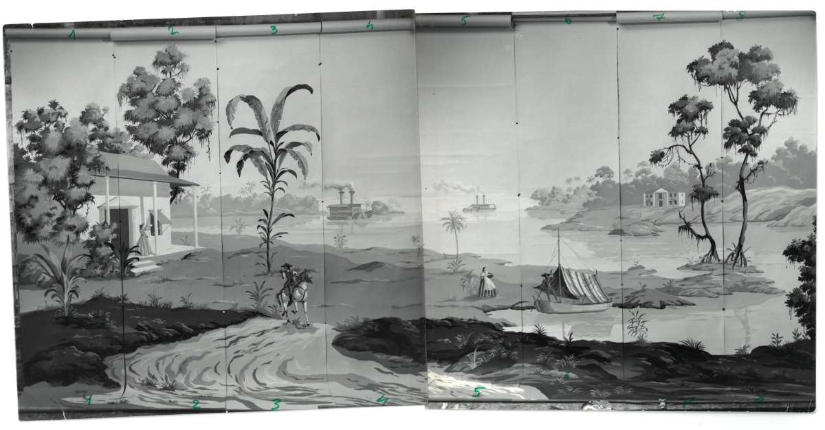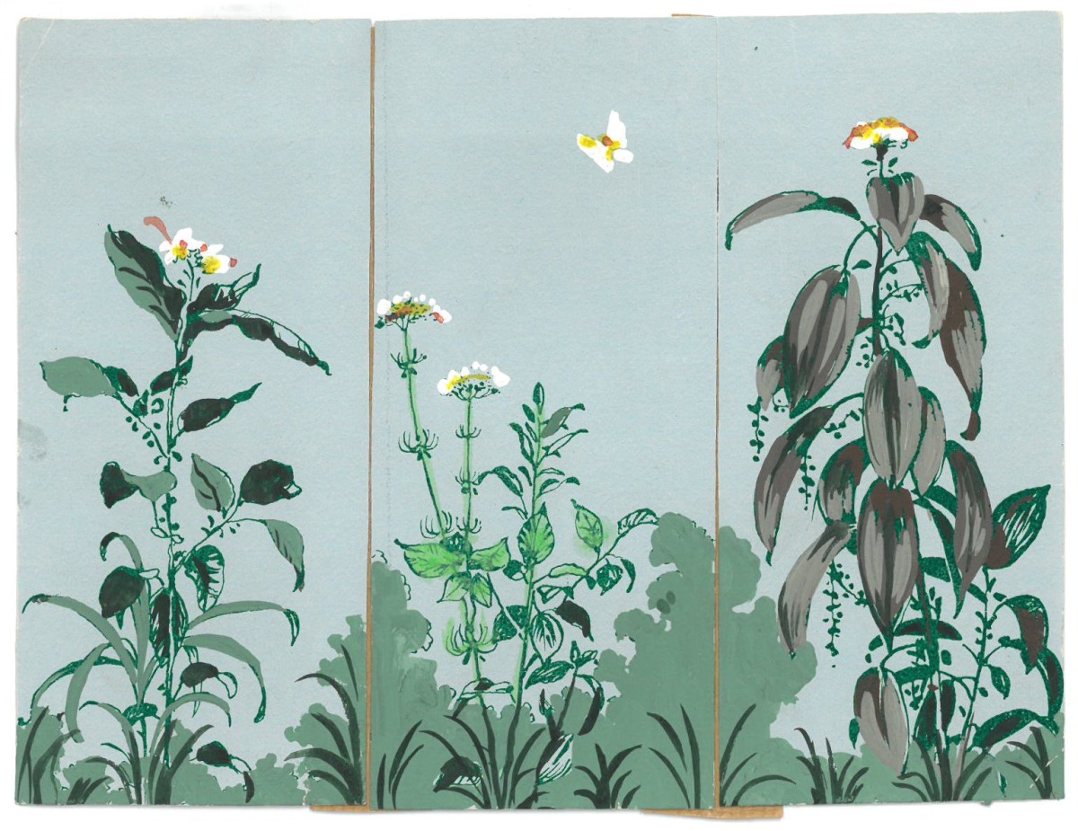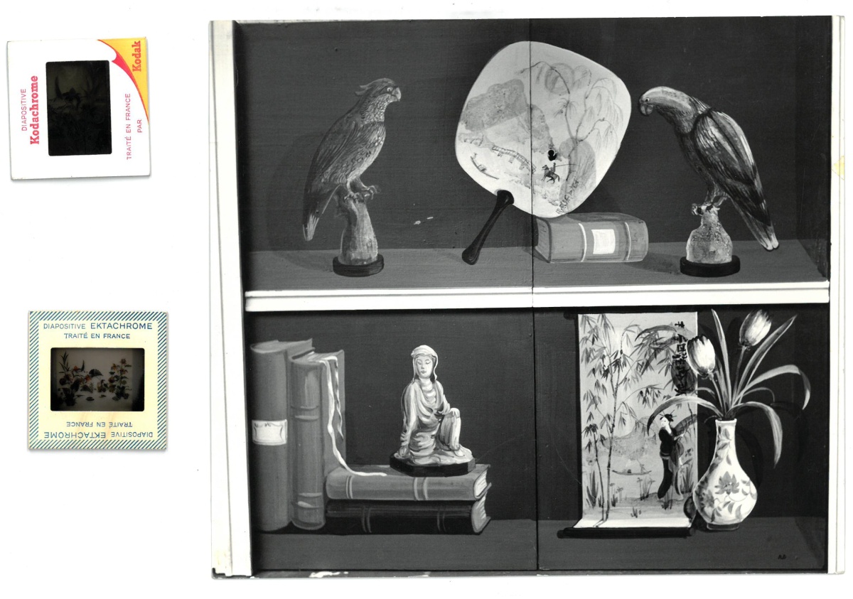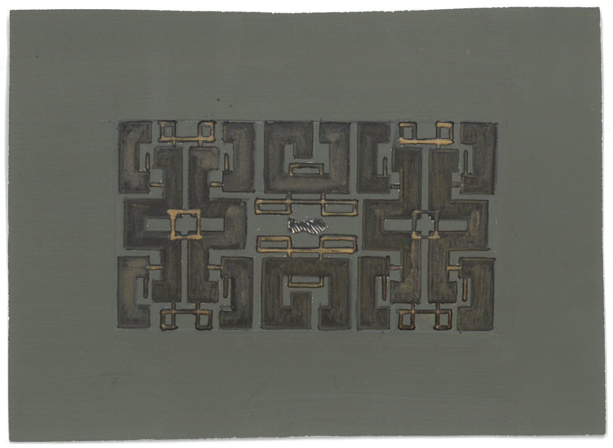 photos, projets de décoration, vues imprimées de panoramiques, quatre dessins gouachés sur calque pour tapisseries de fauteuils par Anatole Kasskoff circa 1938, une maquette de tapis...