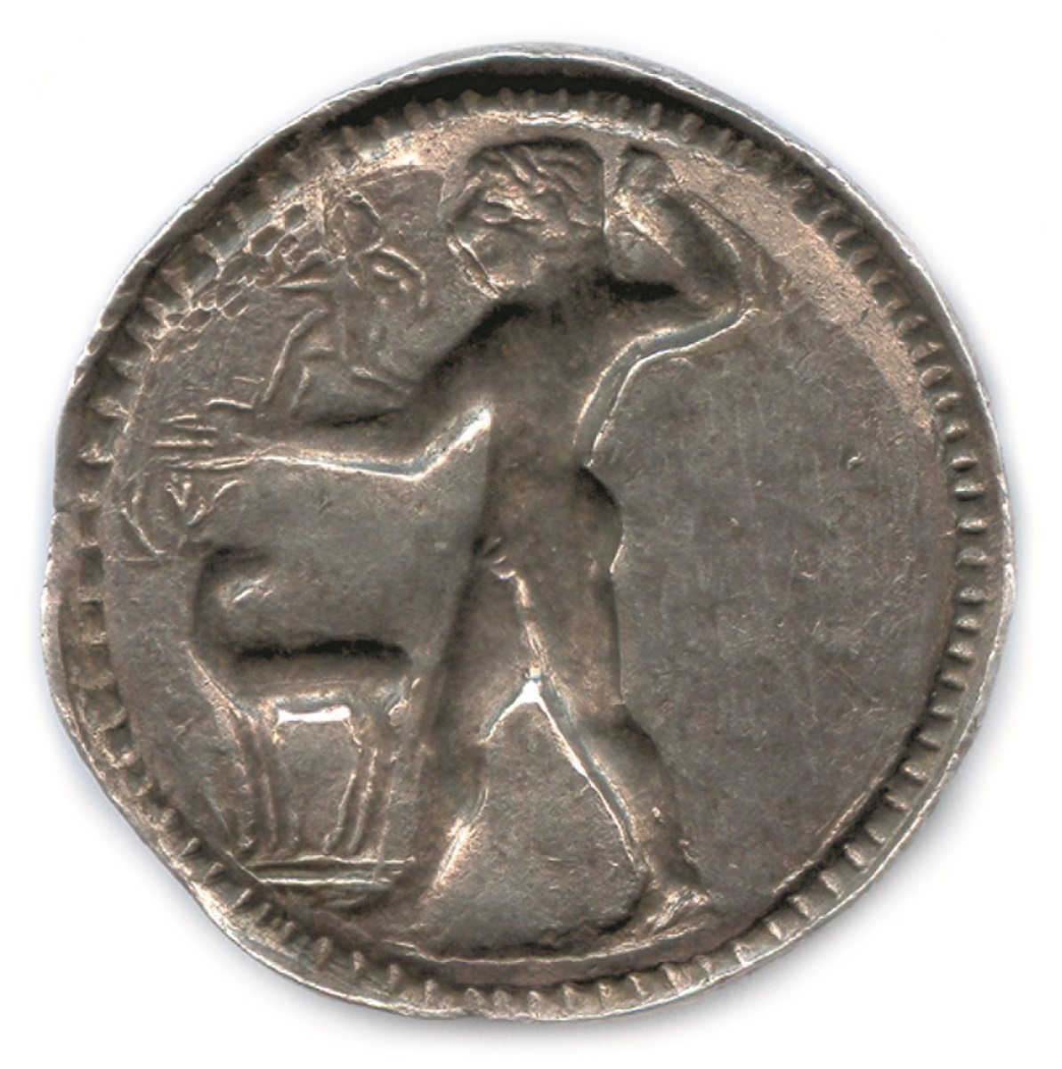 Apollon Catharsios nu (fondateur mythique de la ville) debout à droite, tenant un rameau de la main droite et portant sur le bras gauche une figurine nue (Hermès). Devant, cervidé debout détournant la tête vers le dieu. Cercle radié au pourtour. R/. Même type incus.
