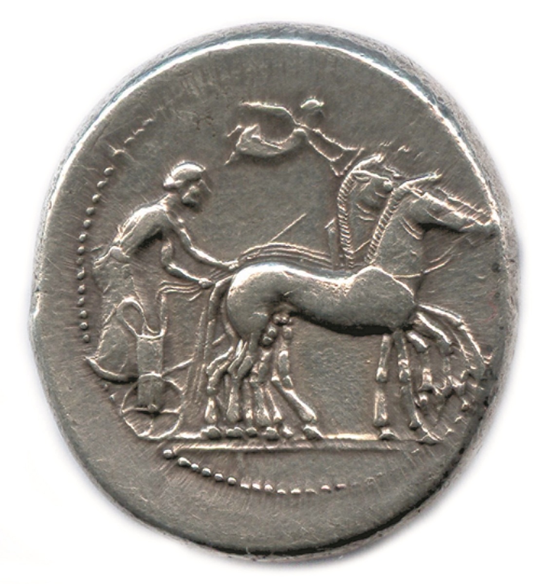 R/. Bige de chevaux conduit au pas à droite par un aurige et couronné par une Victoire.