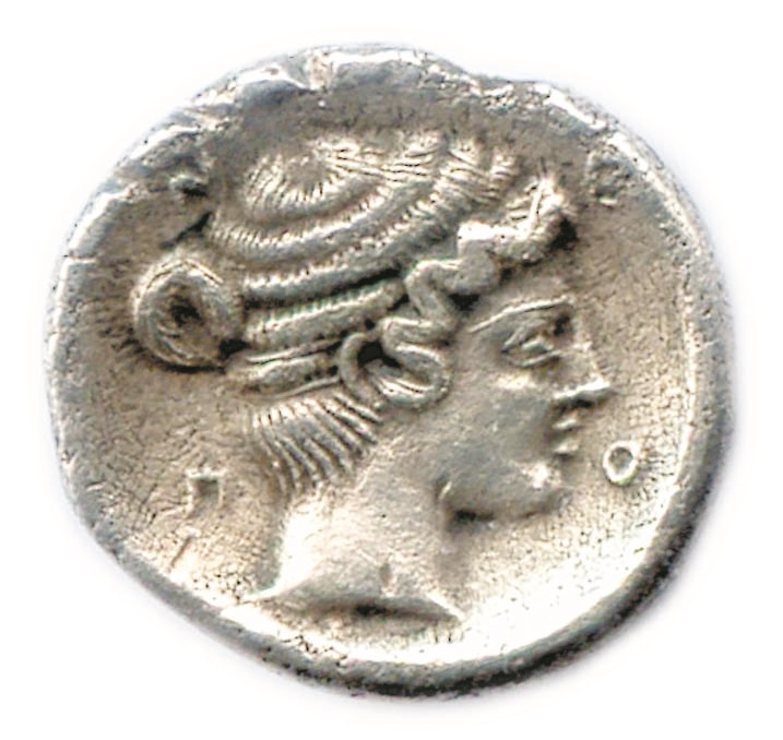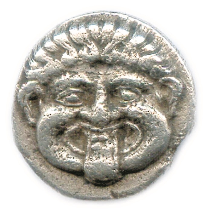Tete de Gorgone de face tirant la langue. R/. Tete d'Artemis Parthenos a droite.