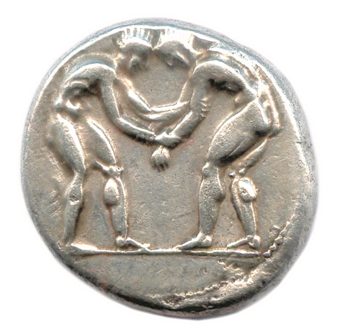 Deux lutteurs aux prises. R/. Frondeur dans un carré perlé. Devant, triskèle. En bas à droite, un oiseau en contremarque.