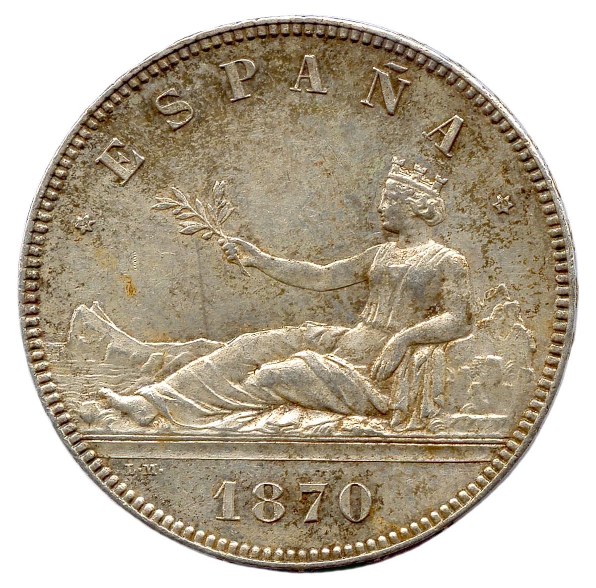 Pièce de 5 Pesetas argent 1870 M = Madrid.