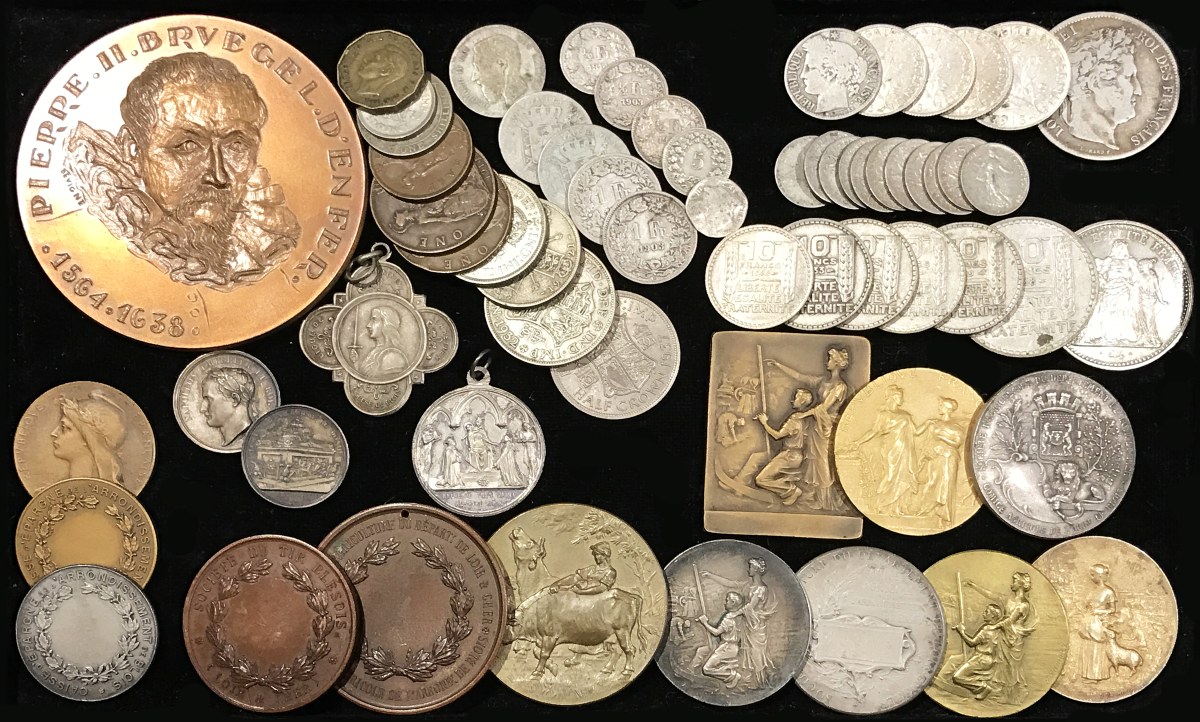 Lot de 43 monnaies et 18 médailles diverses en argent, en bronze et divers métaux: