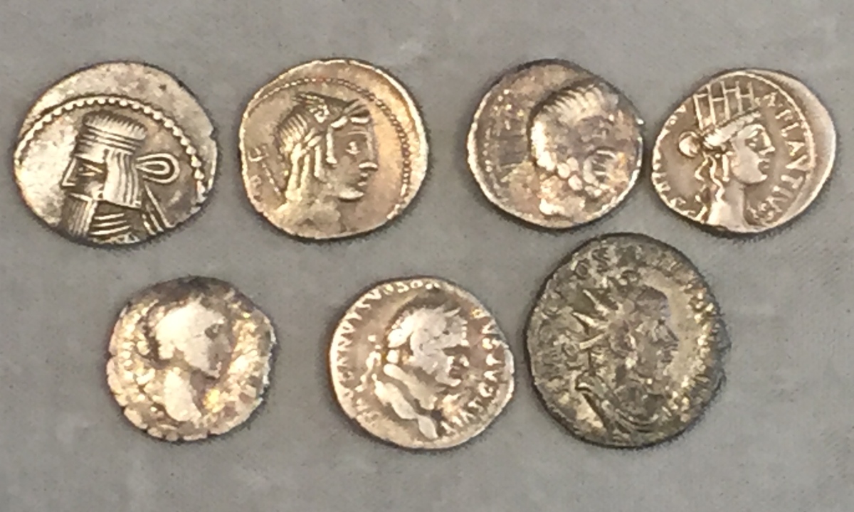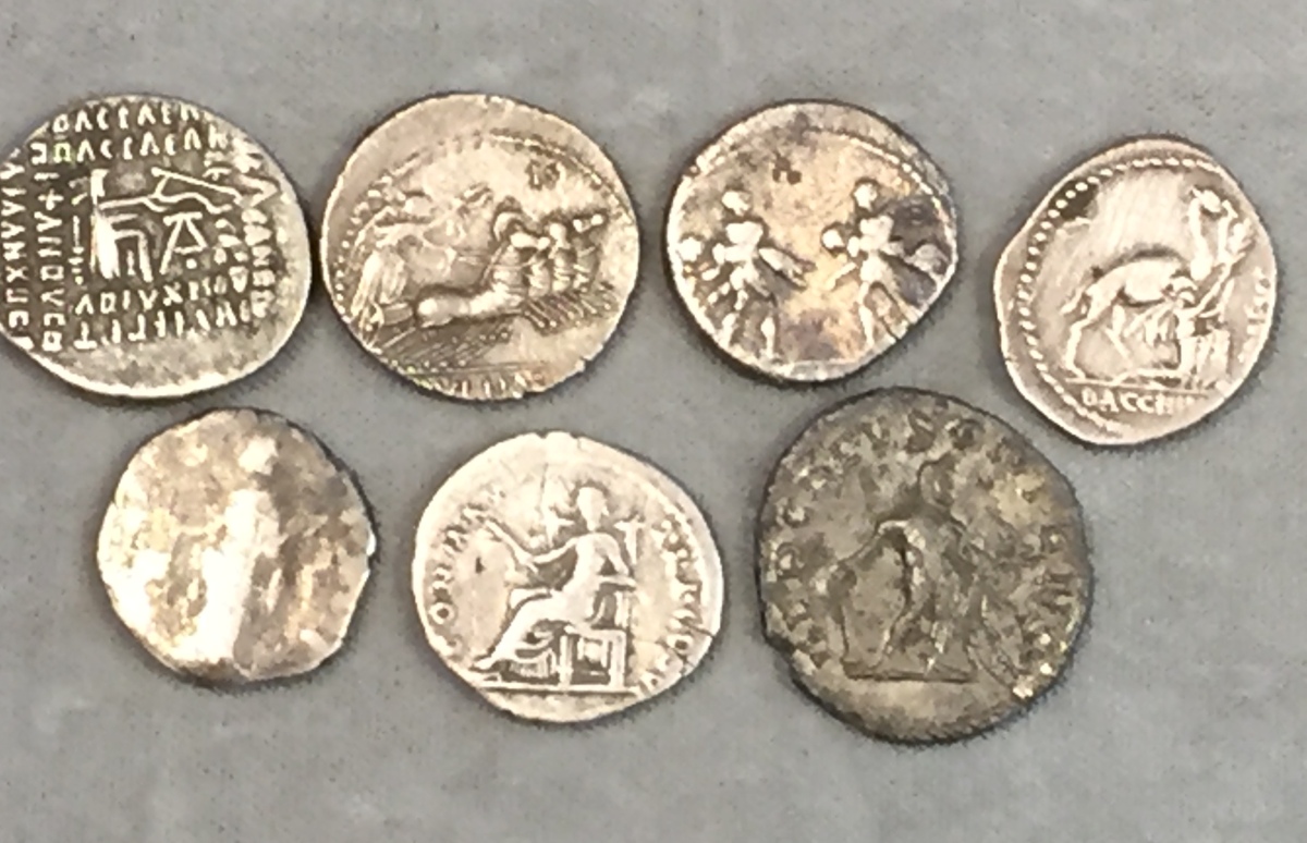 DRACHME du royaume des Parthes, trois DENIERS de la République romaine dont un représentant au revers "lenlèvement des Sabines", deux DENIERS de lEmpire romain et un ANTONINIEN de Postume.