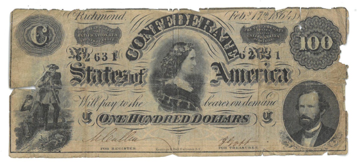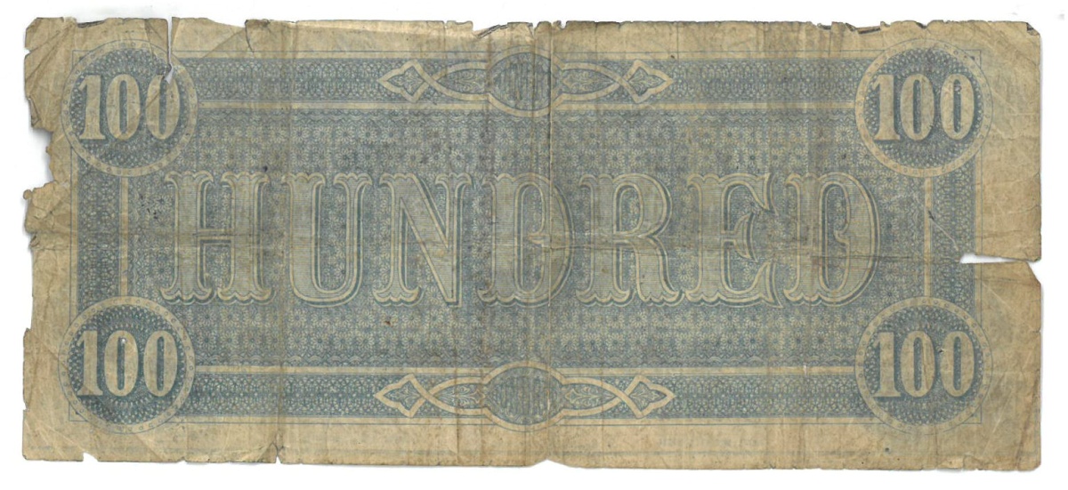 ÉTATS CONFÉDÉRÉS D'AMÉRIQUE. BILLET de 100 dollars, 1864. (en l'état)