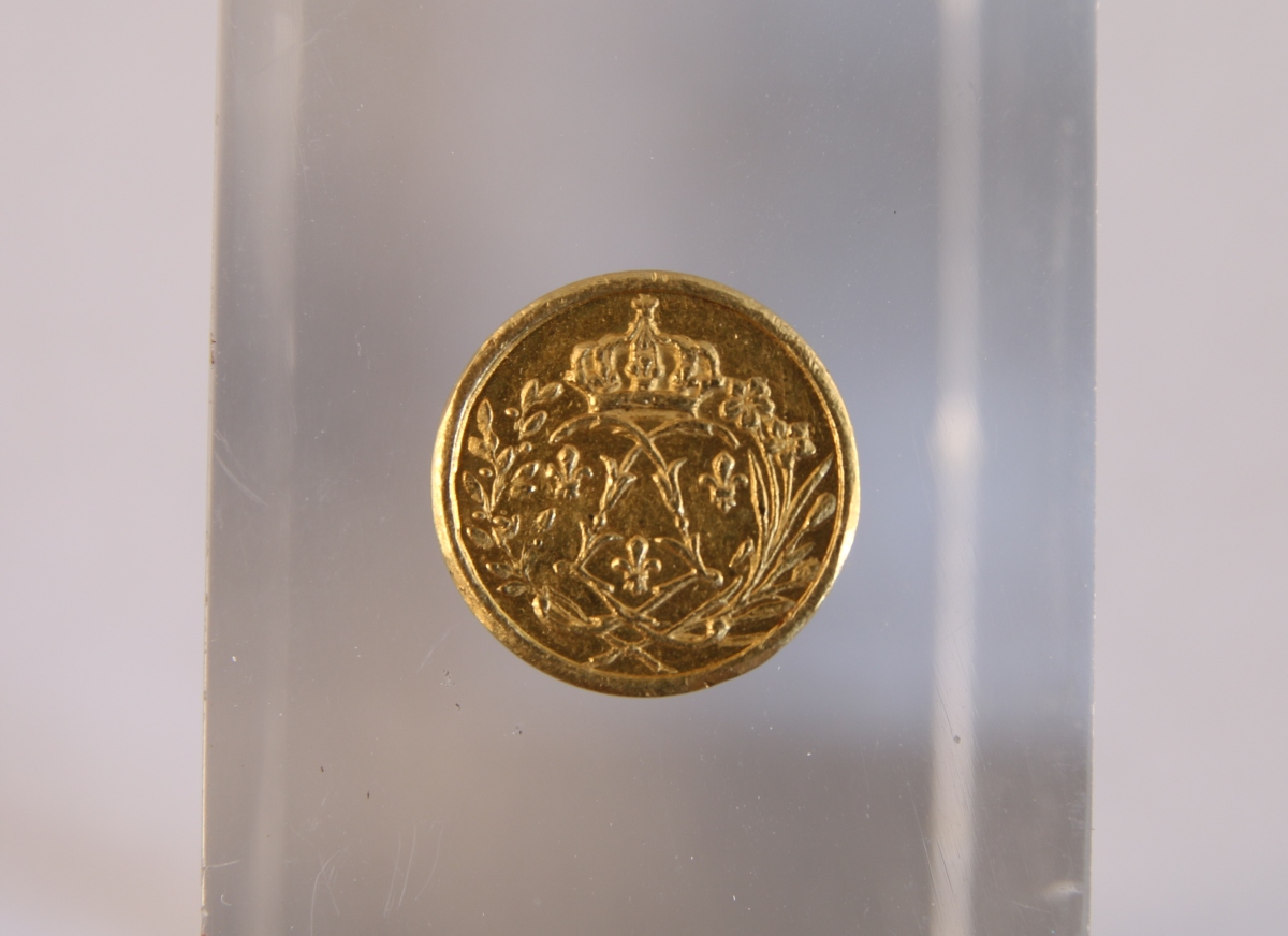 FRANCE. Louis XVIII. MÉDAILLE en or figurant le Roi en buste de profil. Le revers présente le chiffre royal agrémenté de trois fleurs de lys timbré de couronne royale.