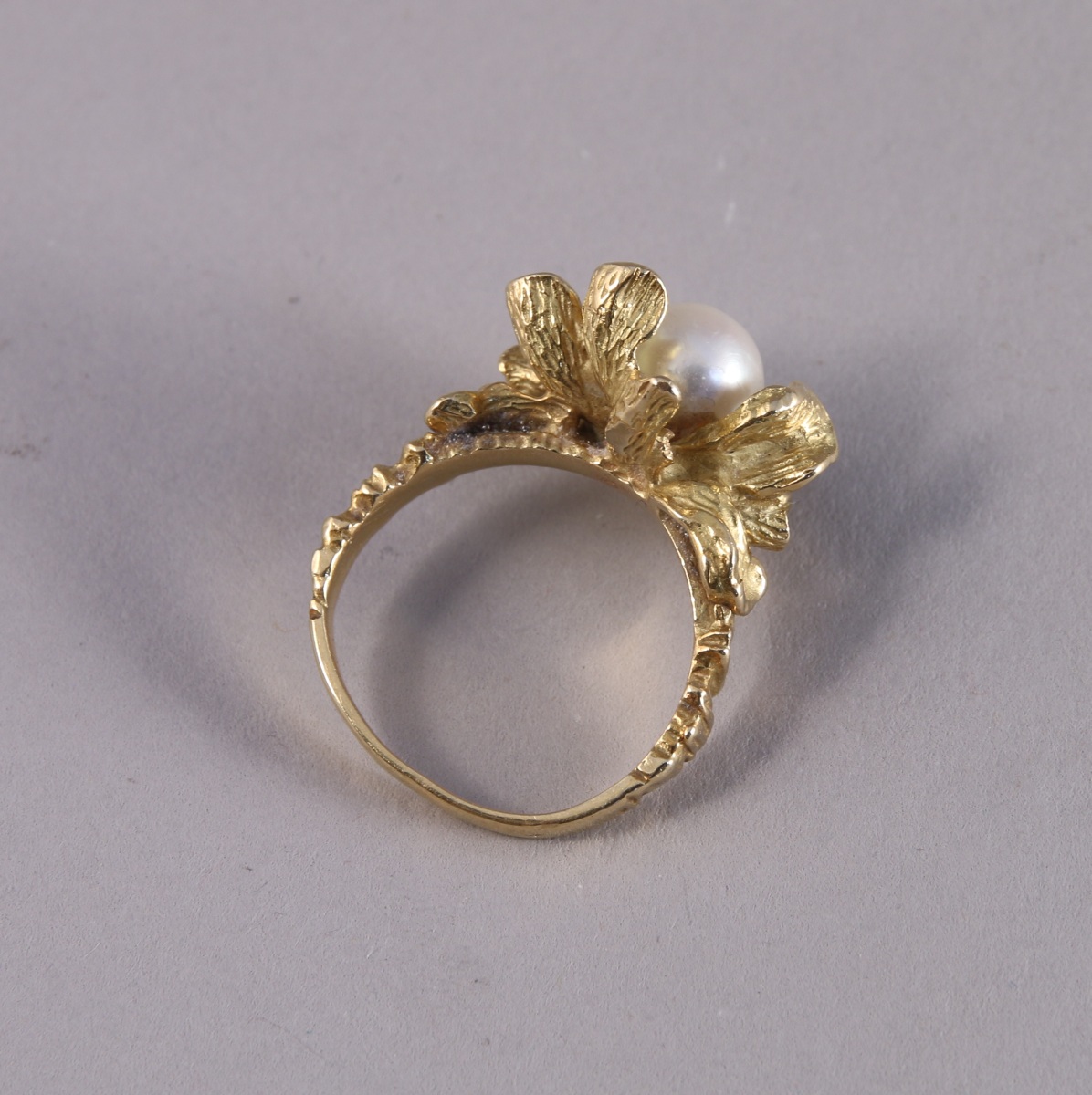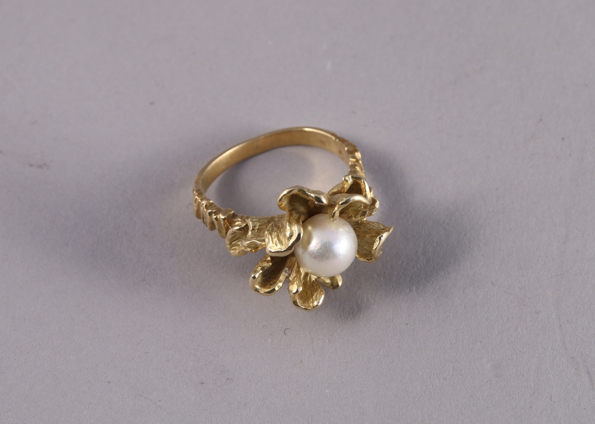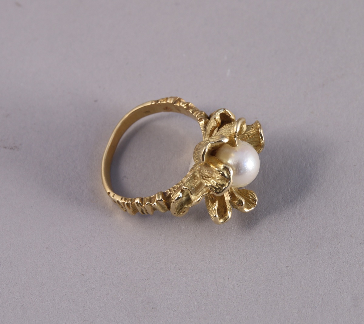 BAGUE en or jaune en forme de fleur ornée d'un PERLE en son centre.