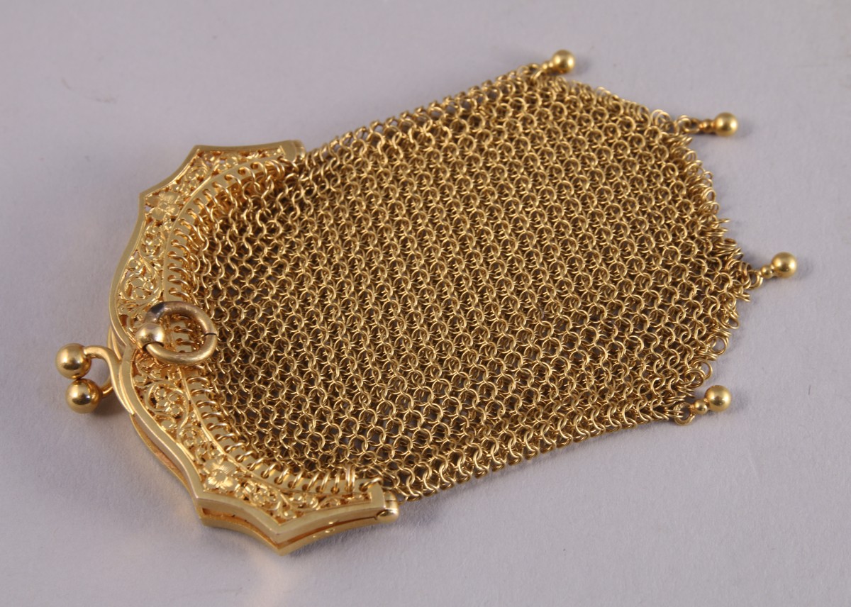 PORTE-LOUIS en or jaune, la bourse à mailles souples ornée de quatre petites gouttes. Le fermoir avec une béliaire ajouré d'arabesques.
