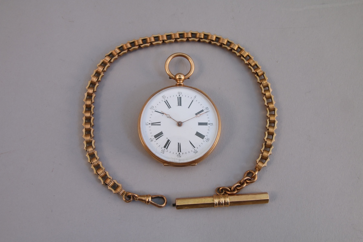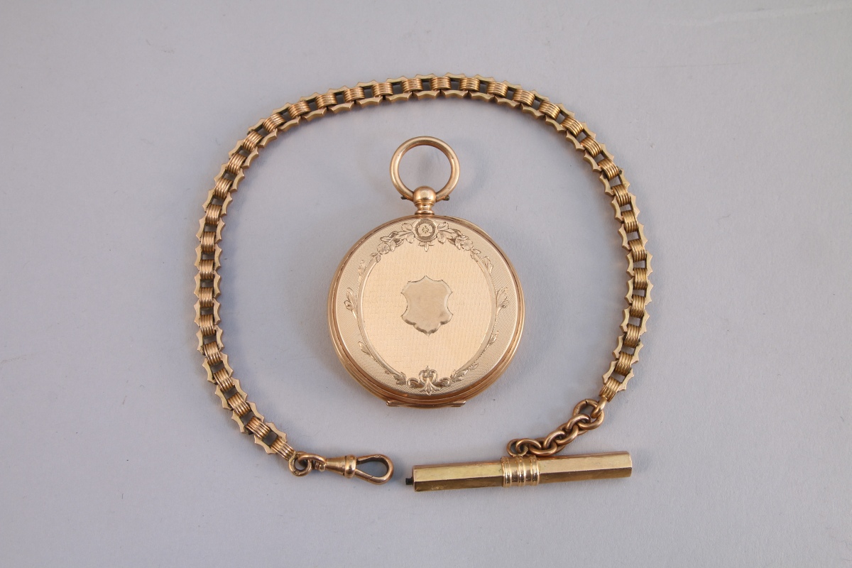 MONTRE de GOUSSET en or jaune au boitier guilloché entouré d'une guirlande fleurie avec un écusson. Cadran émaillé gradué pour les minutes avec les heures en chiffres romains. Remontoir à clé derrière la platine. Cache-poussière en or gravé "Cylindre 8 rubis".