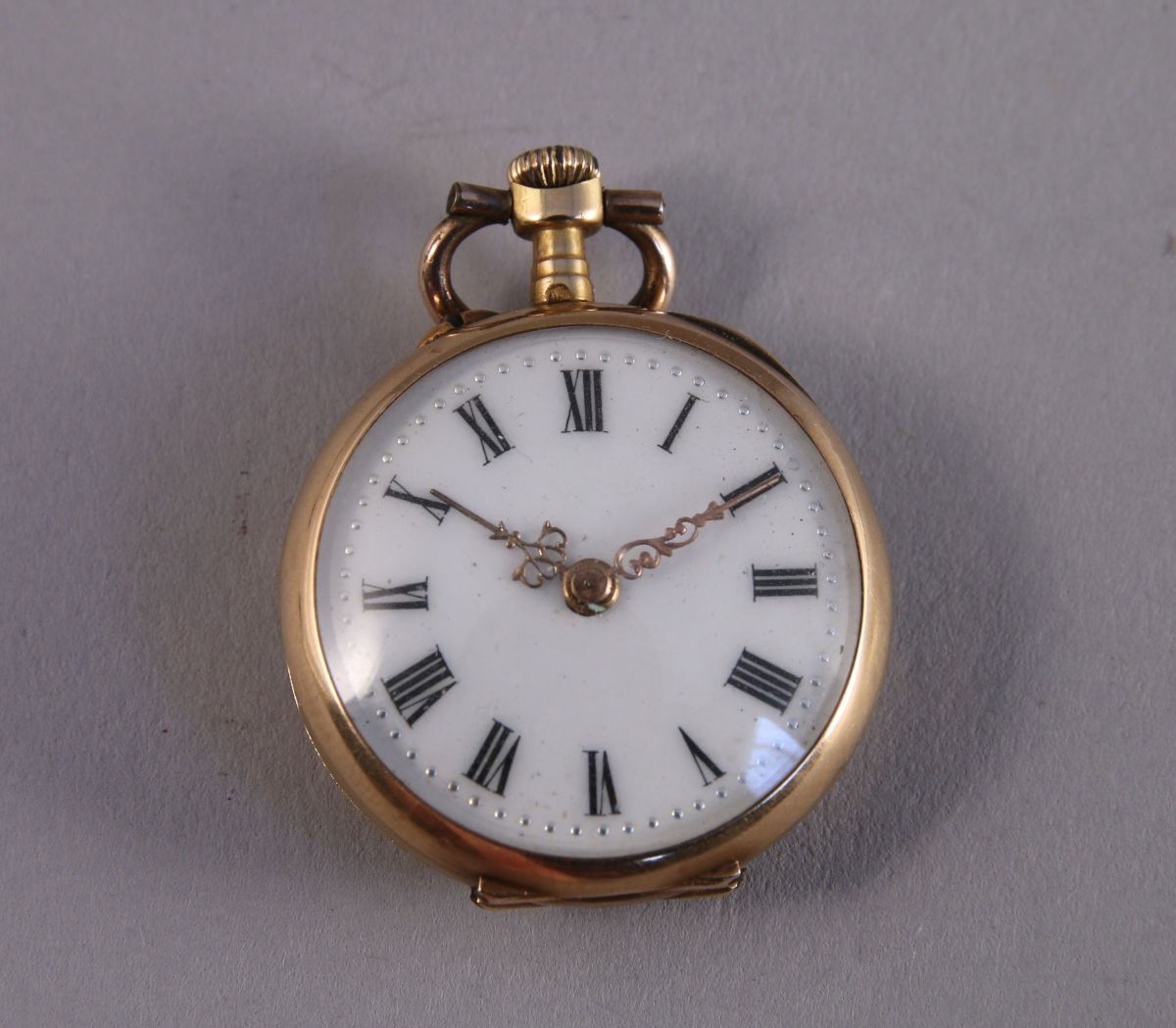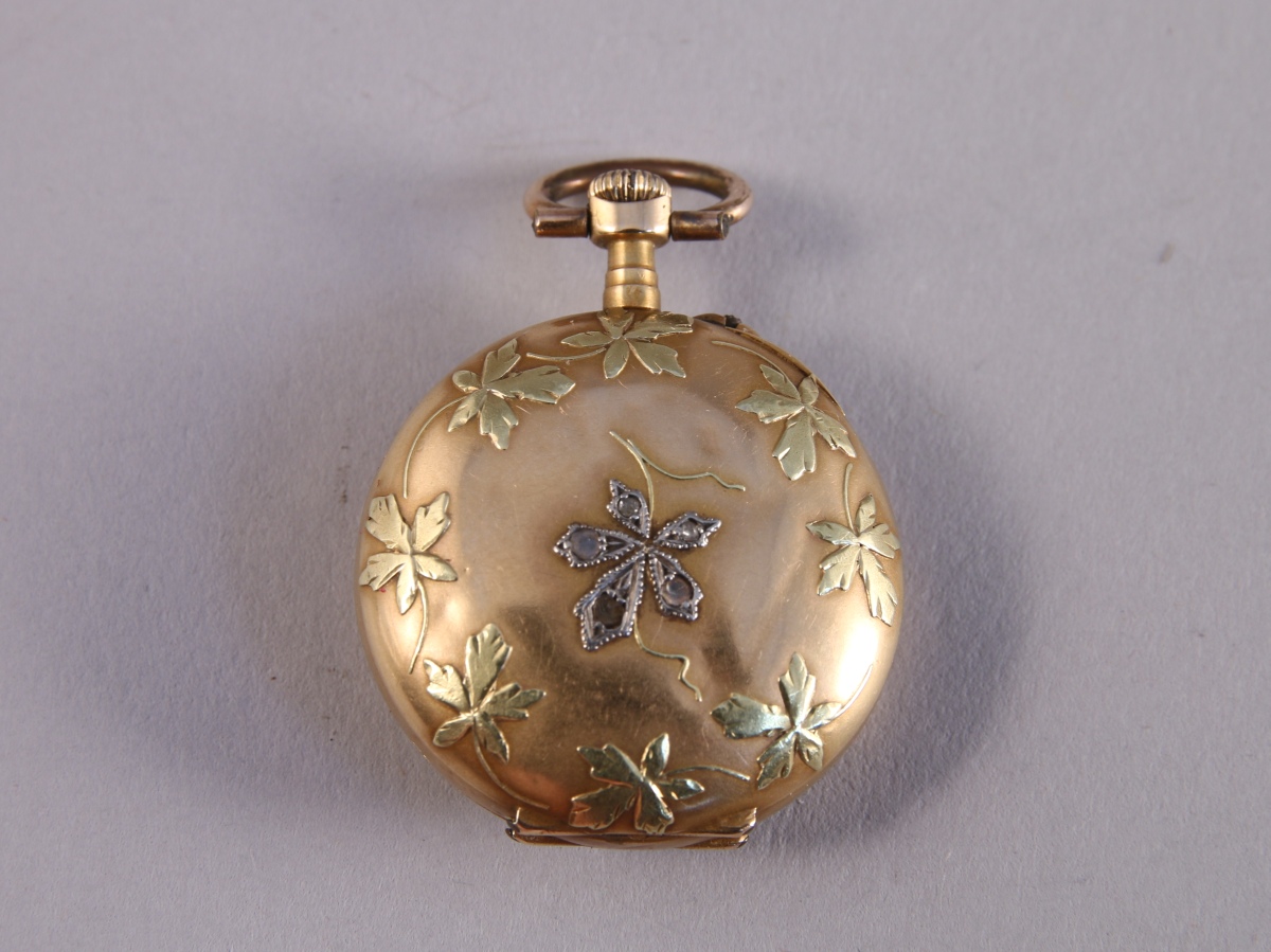 Petite MONTRE de COL en or jaune et rose, le boitier orné de fleuilles d'érable réhaussées de pierreries. Cadran émaillé gradué pour les minutes avec les heures en chiffres romains.Remontoir à 12 heures. Cache poussière en or.