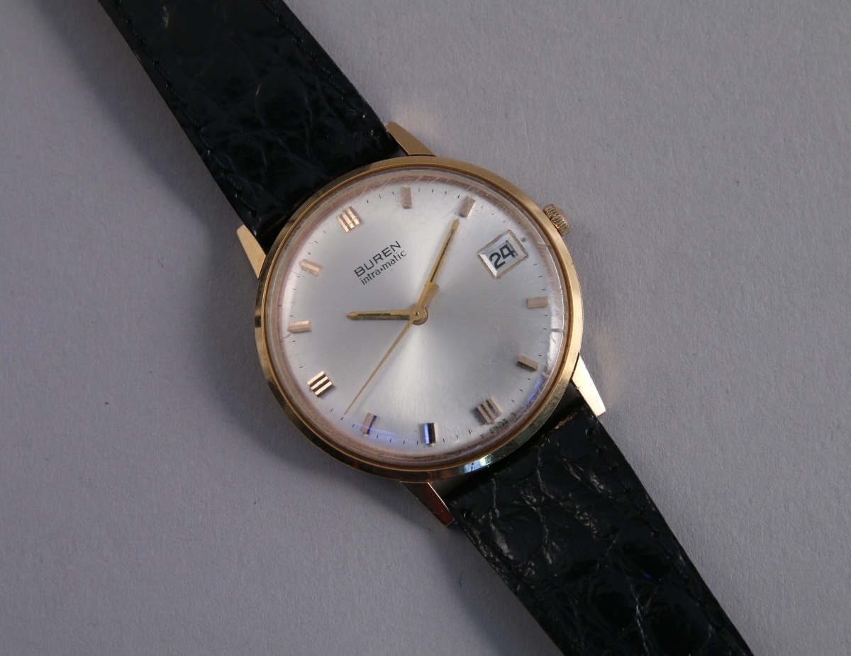 BUREN. MONTRE-BRACELET d'homme en or jaune. Modèle "intra-matic". Mécanisme à remontage manuel (accdt). Cadran métallique à index bâtonnets et guichet dateur. Boîtier numéroté 935702. Bracelet de cuir noir rapporté.