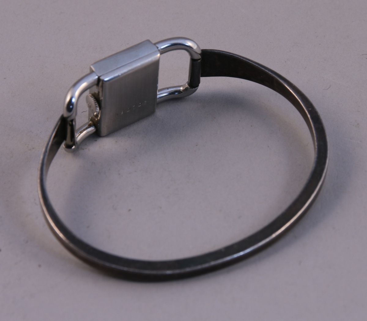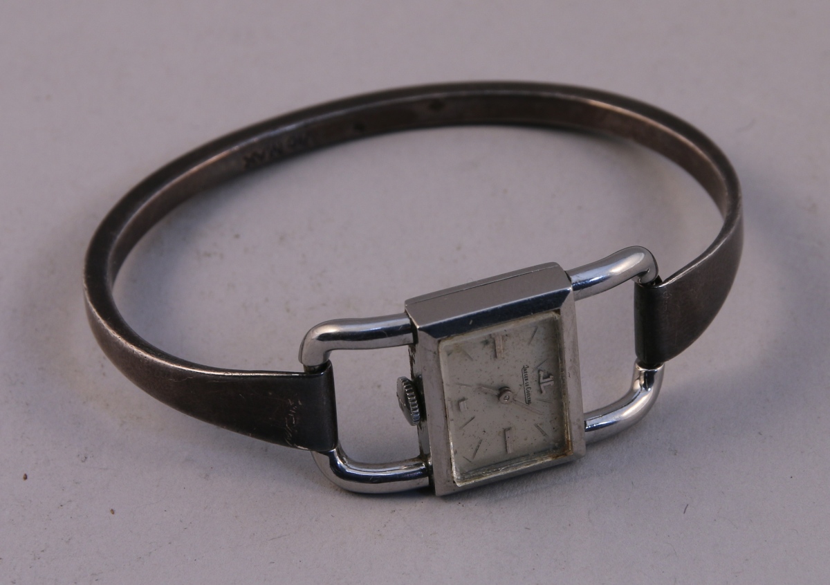 JAEGER-LECOULTRE. MONTRE-BRACELET de dame, bracelet rigide en argent. Cadran de forme rectangulaire à fond blanc indiquant les heures à index bâtonnets. Le boîtier numéroté 892723.