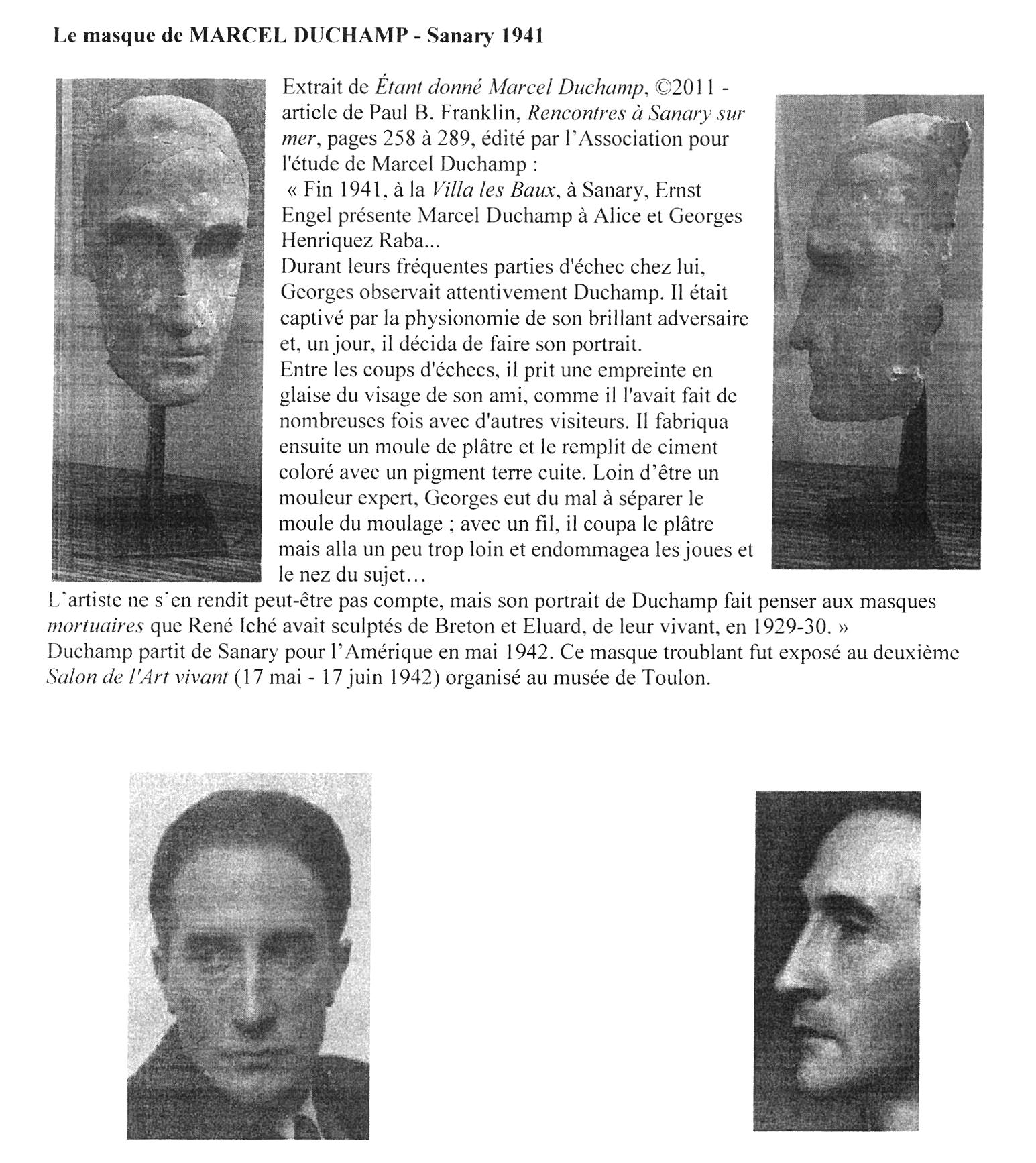 L'artiste ne s'en rendit peut-être pas compte, mais son portrait de Duchamp fait penser aux masques "mortuaires" que René Iché avait sculpté de Breton et Eluard, de leur vivant, en 1929-30."