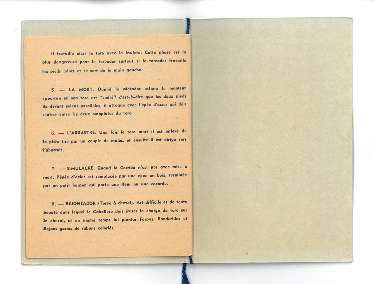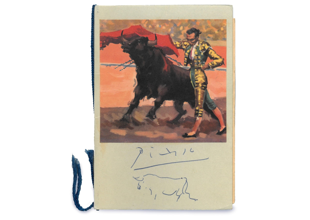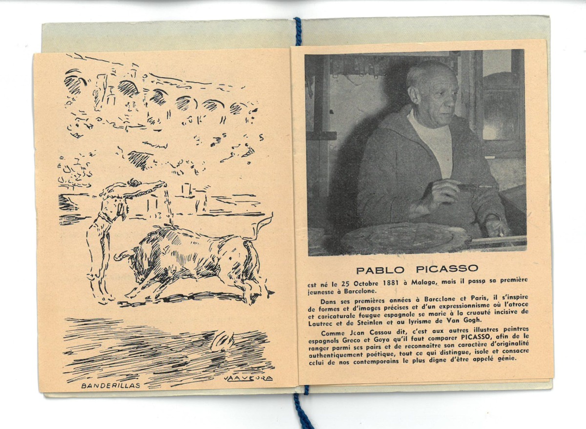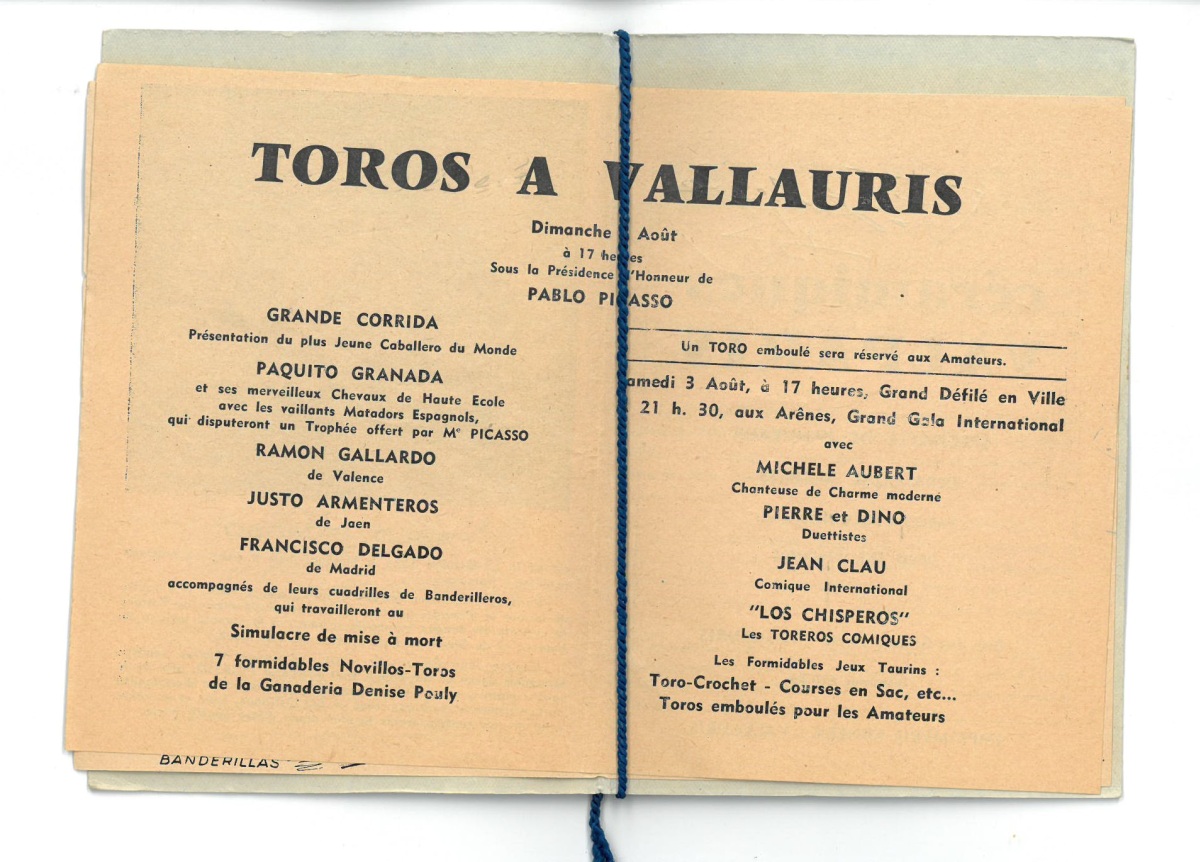 Sur la couverture du programme de la Fiesta taurine du 4 août 1957 «sous la présidence dhonneur de Pablo Picasso ». Livret de 8 pages réunies par une couverture cartonnée.