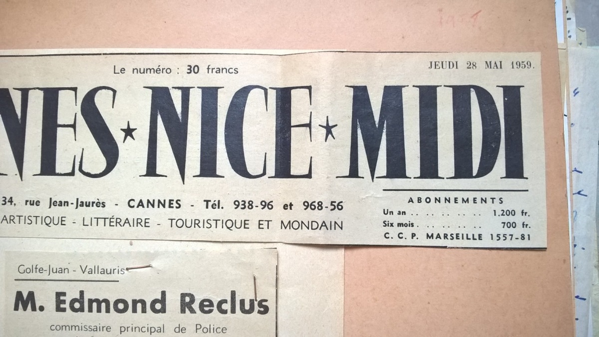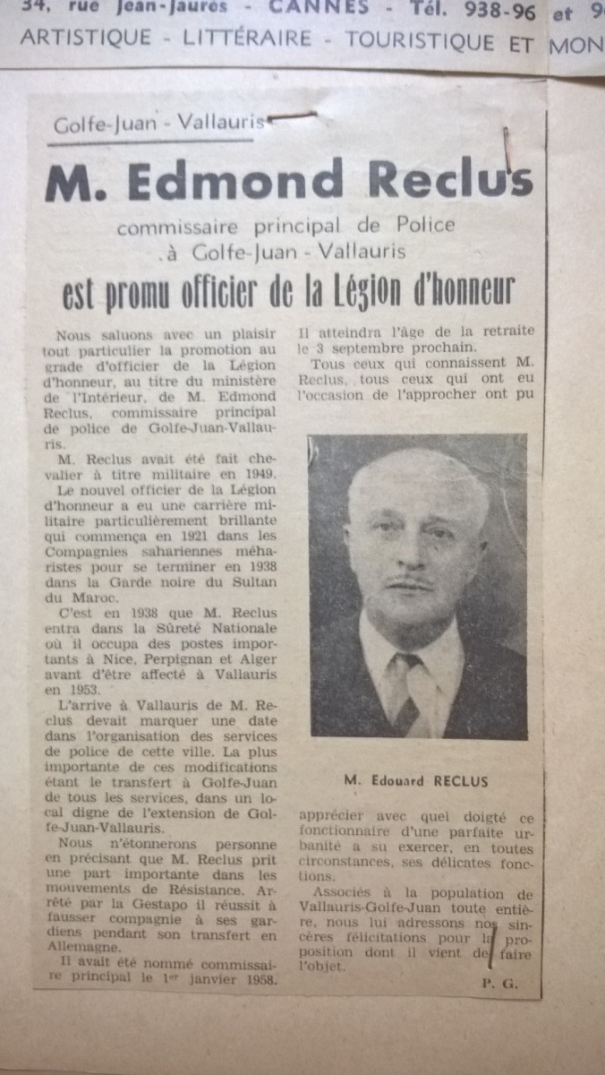 - Article de presse annonçant la promotion d'Edmond Reclus comme chevalier de la Légion d'Honneur. Cannes-Nice-Midi, 28 mai 1959.