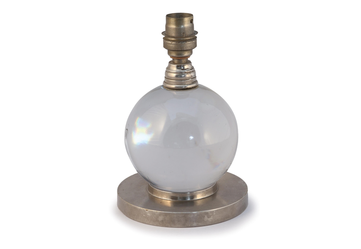 Boule de cristal transparent sur un socle circulaire en bronze nickelé. Bague en inox. Électrifiée.
