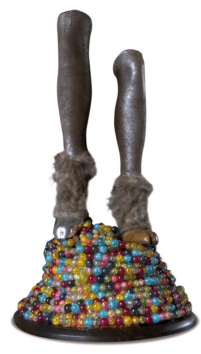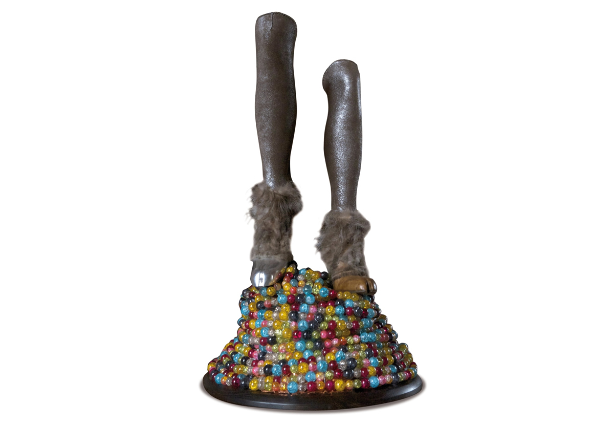 Cuir, fourrure, perles de verre, fils de métal, socle en bois.