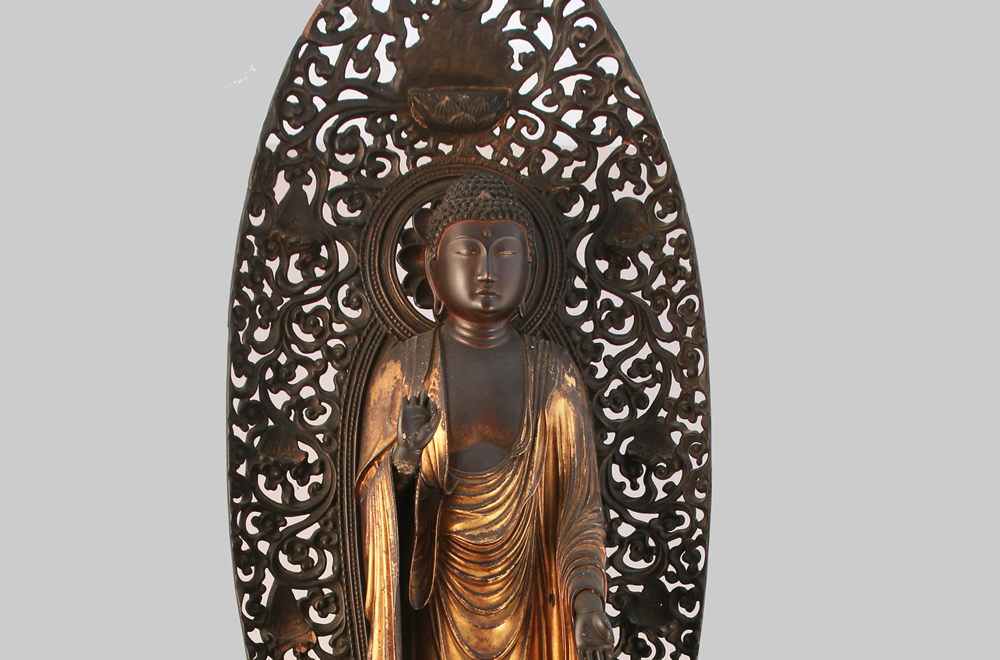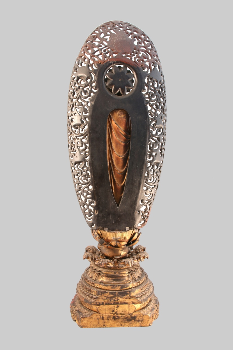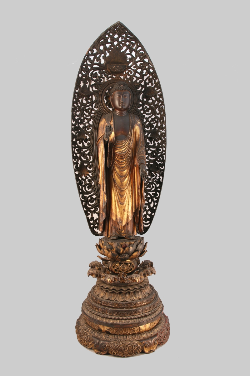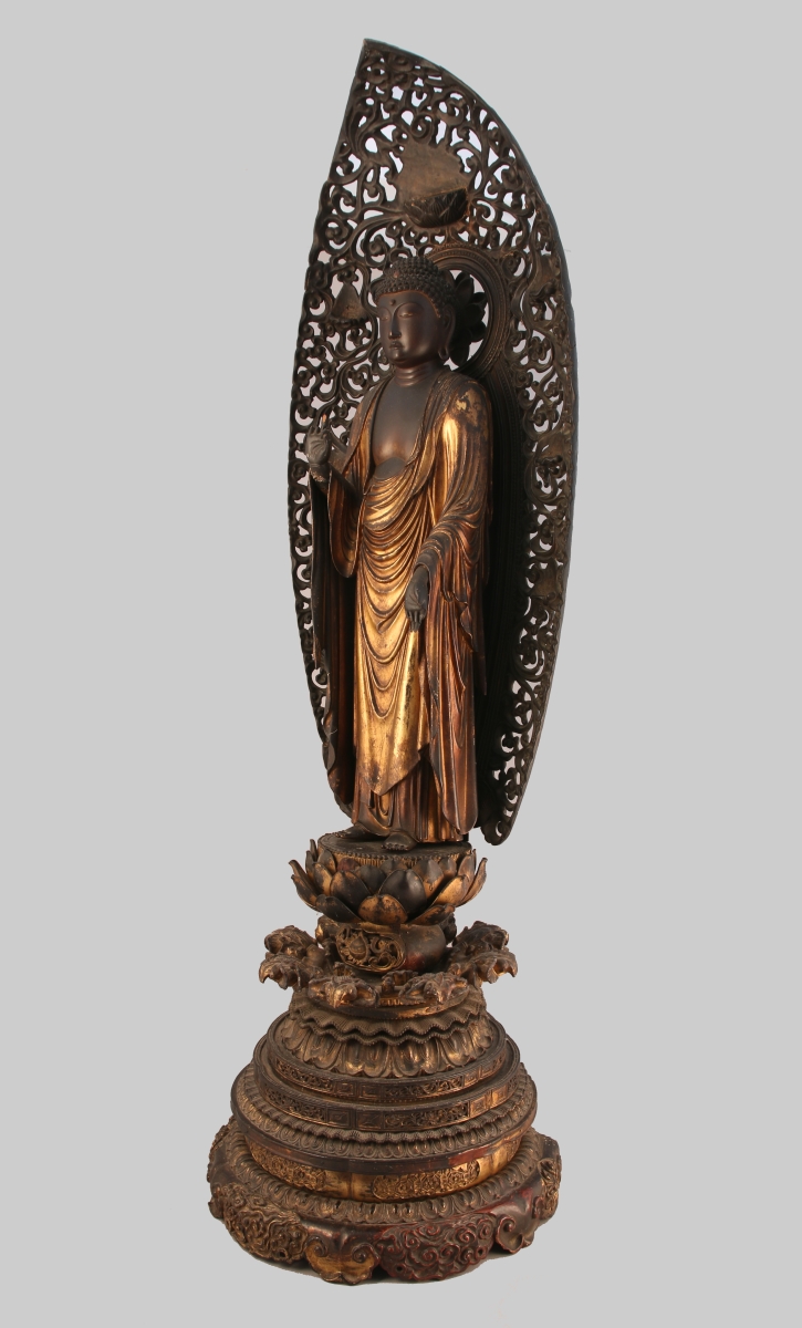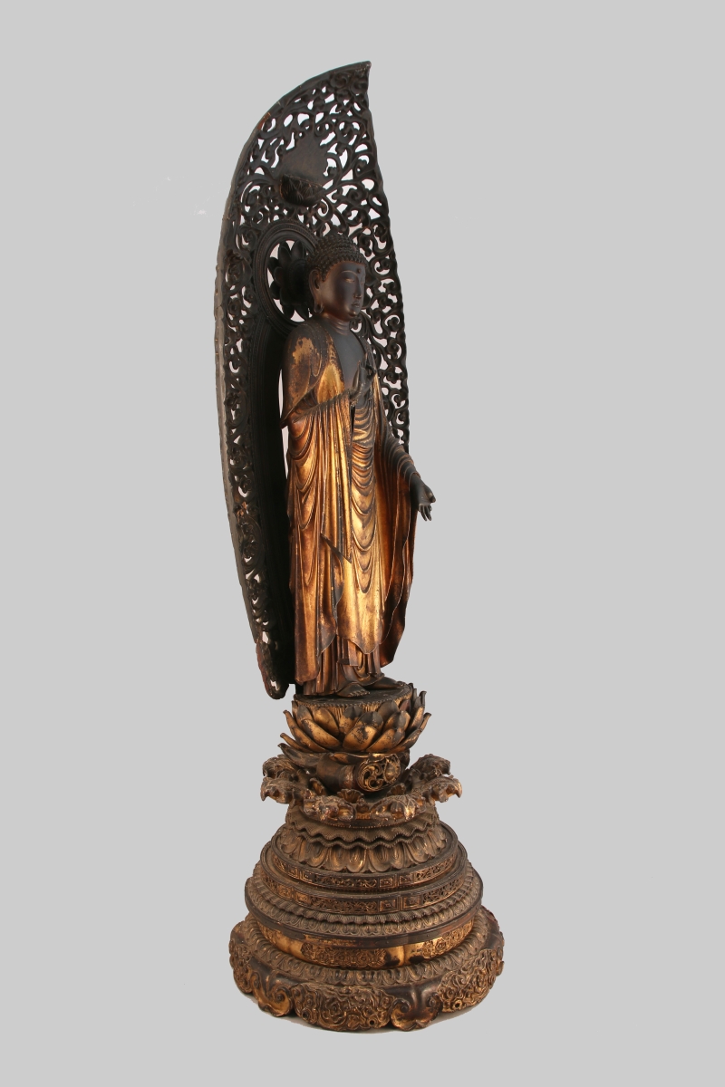 BOUDDHA AMIDA en bois partiellement laqué doré, debout sur un socle en forme de lotus posant sur une haute base sculptée de pétales de lotus, nuées et rinceaux, les mains faisant le geste raigo-in ( signifiant l'accueil au paradis), sa robe retombant en plis souples. Derrière lui une mandorle à motifs ajourés de rinceaux.