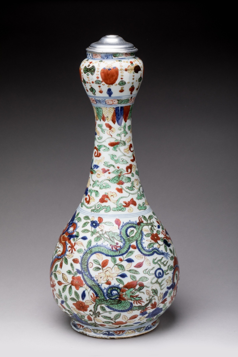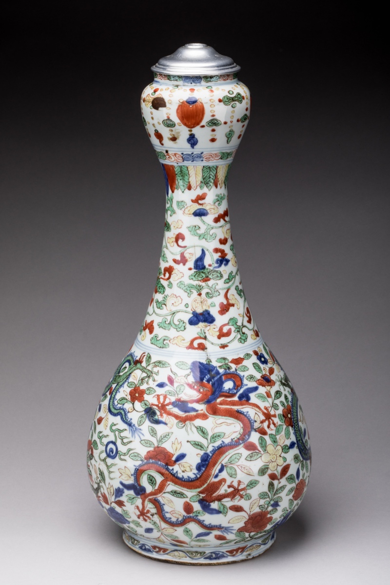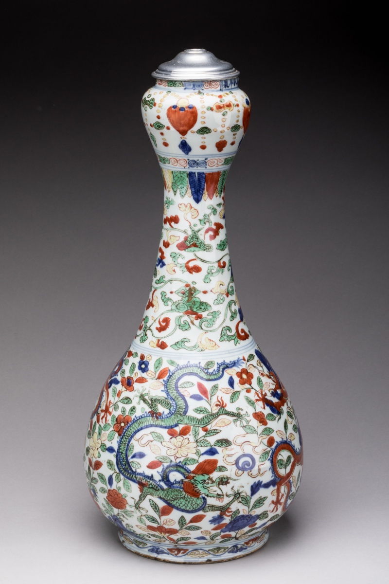 VASE de forme "suan tou ping" (gousse d'ail) en porcelaine décorée en bleu sous couverte et émaux polychromes dit "wucai" à décor de dragons à cinq griffes à la recherche de la perle sacrée parmi des feuillages mouvementés. Marque à six caractères de Wanli en bleu sous couverte au col.