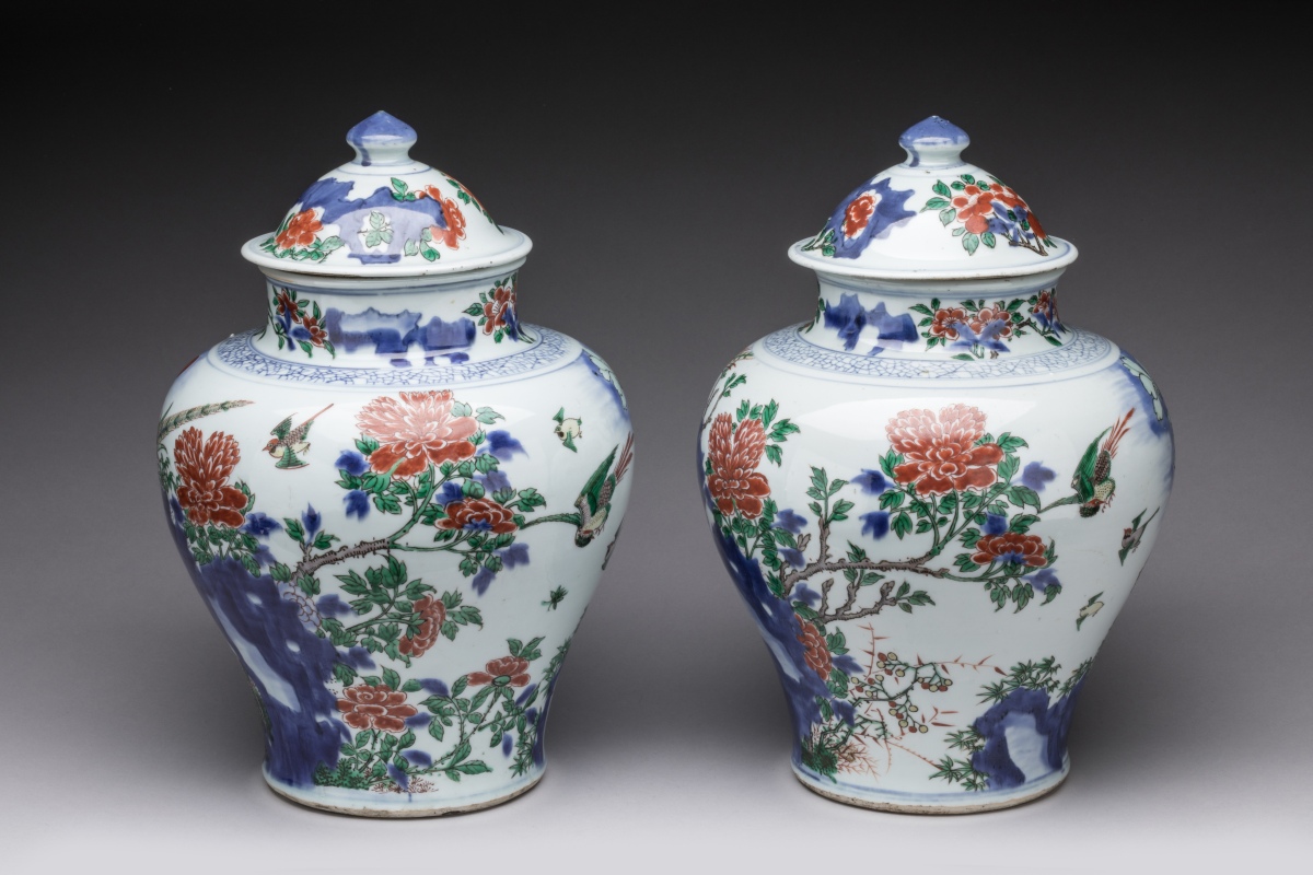CHINA, KANGXI period. A PAIR of porcelain COVERED VASES decorated with "wucai" polychrome enamels.