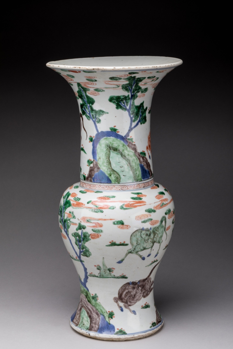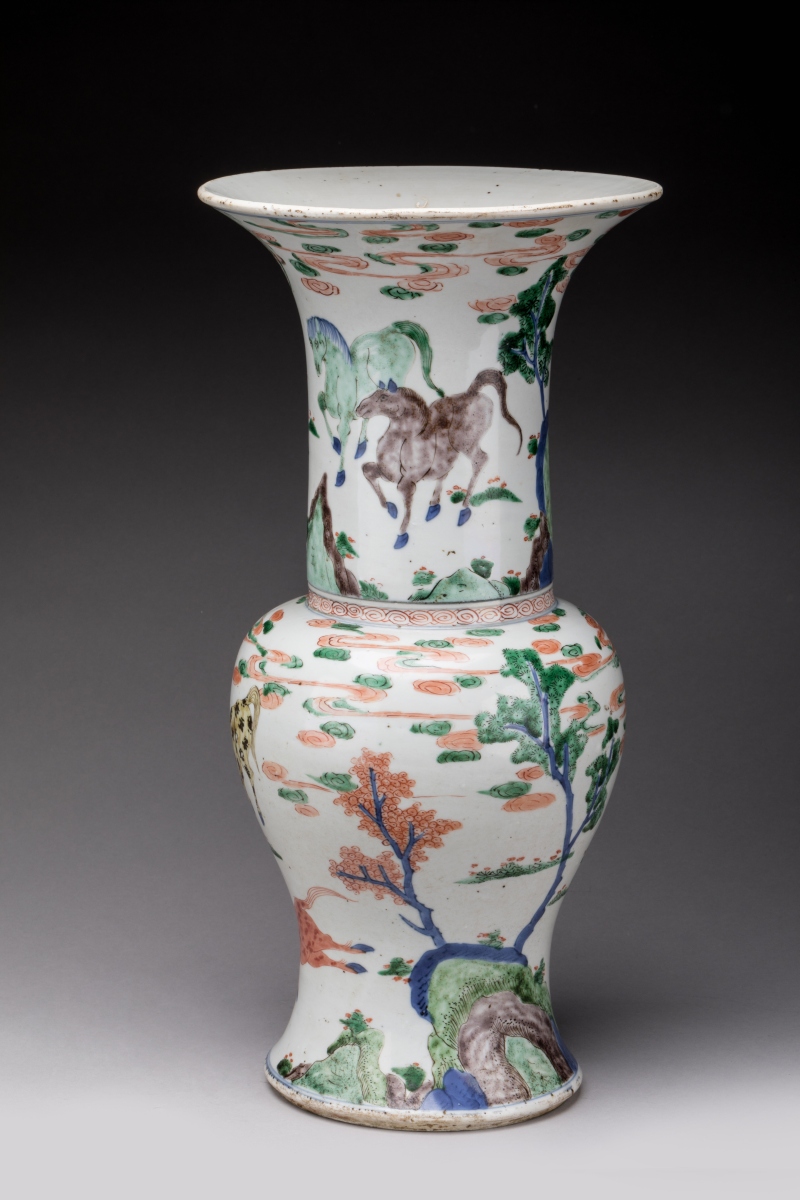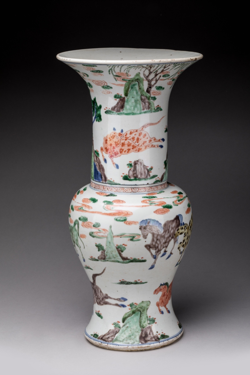 VASE de forme YANYAN en porcelaine à décor en émaux polychromes de la famille verte de huit chevaux galopant et paissant dans un paysage rocailleux et parmi les nuées.