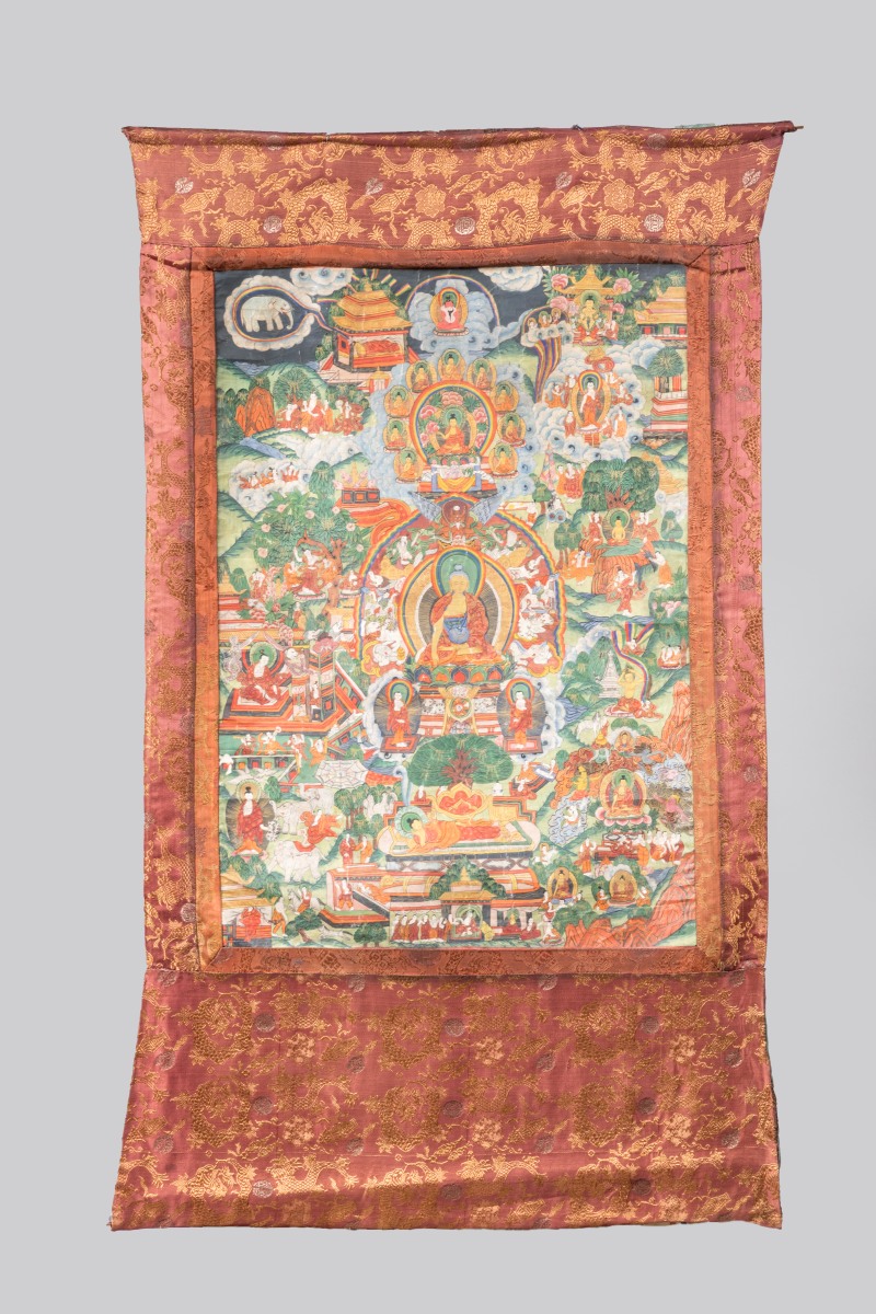 TIBET. A TANGKA depicting scenes of the life of Buddha.