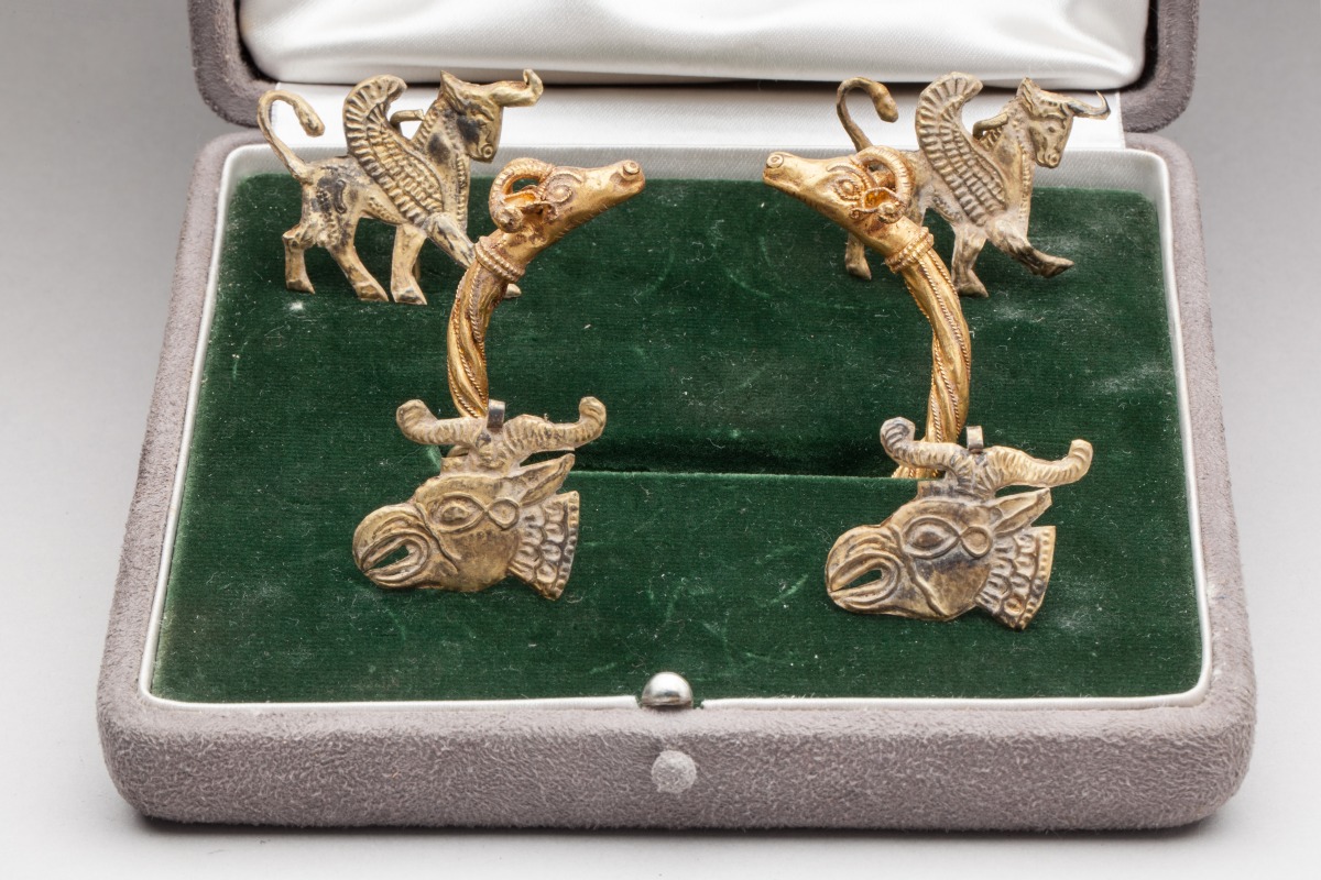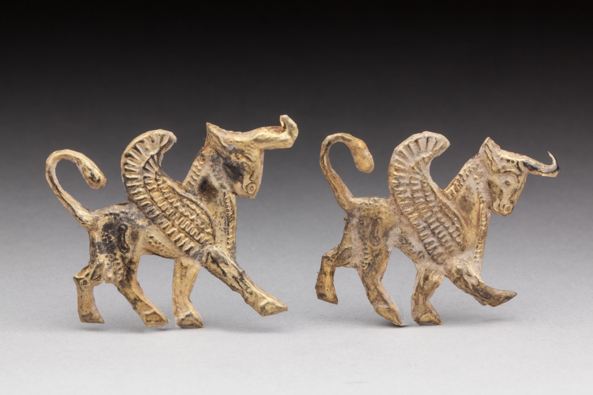 On y joint QUATRE PLAQUES en or repoussé: deux à tête de griffon et deux figurant un taureau ailé.