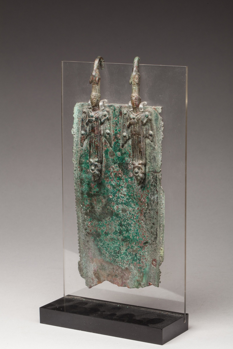 ÉTRURIE. FERMAIL en bronze laminé à patine de fouille. Plaque rectangulaire sur laquelle sont fixées au moyen de petits clous, deux figurines ailées la tête surmontée de l'avant-corps d'un animal dont le bec recourbé servait de fermoir.